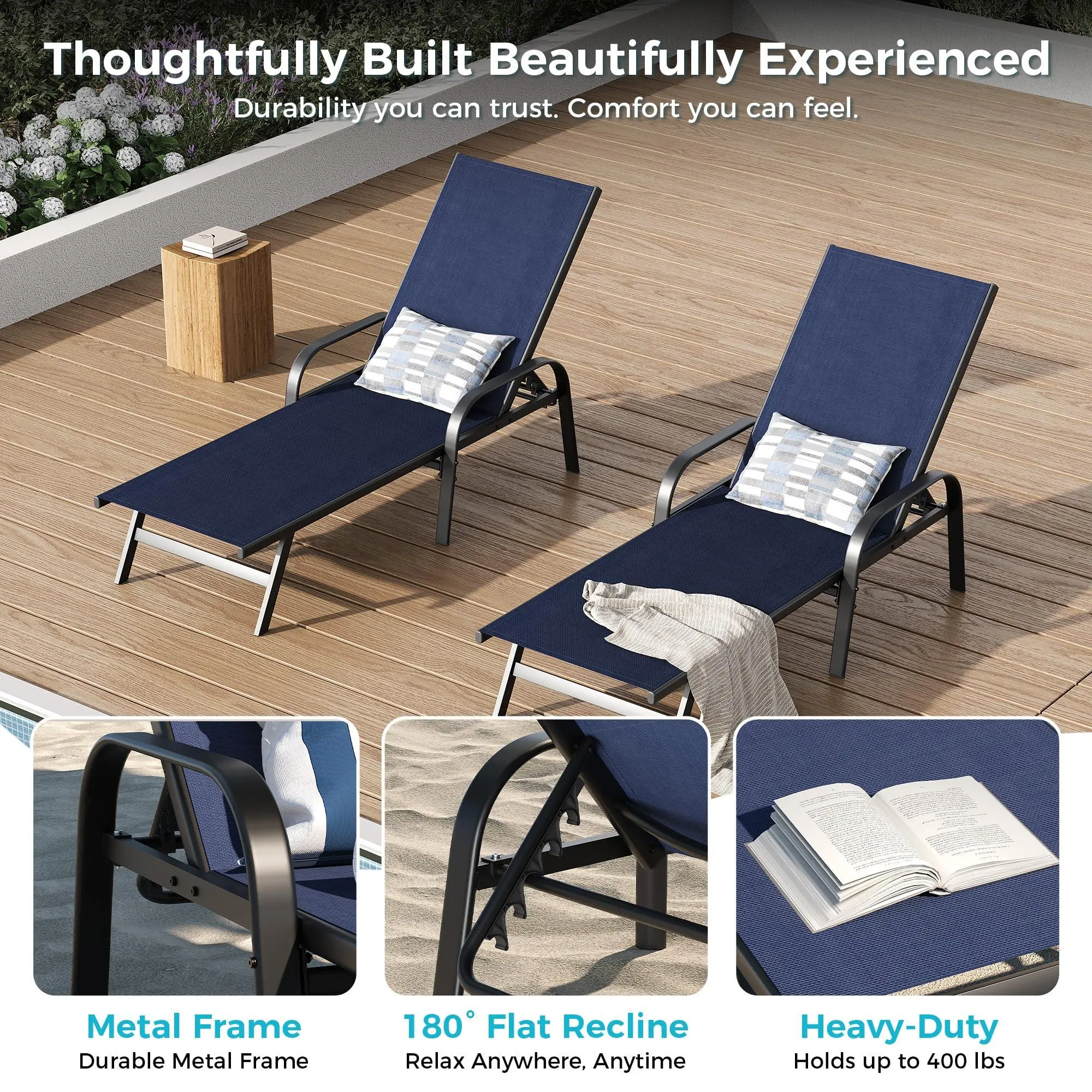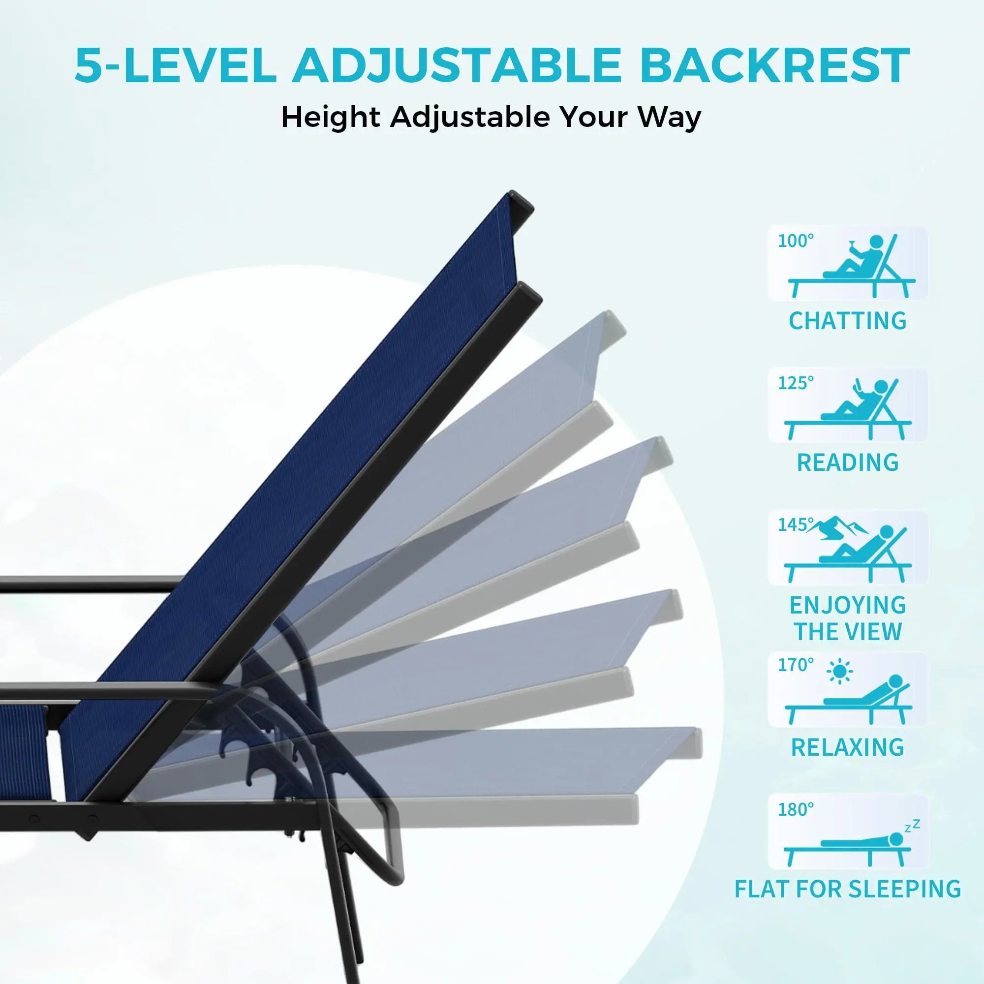 Adjustable Reclining Backrest – Featuring a 5-position adjustable outdoor chaise design, the backrest reclines from 125° to a full 180°, allowing you to sit upright, recline, or lie flat for reading, sunbathing, or resting.