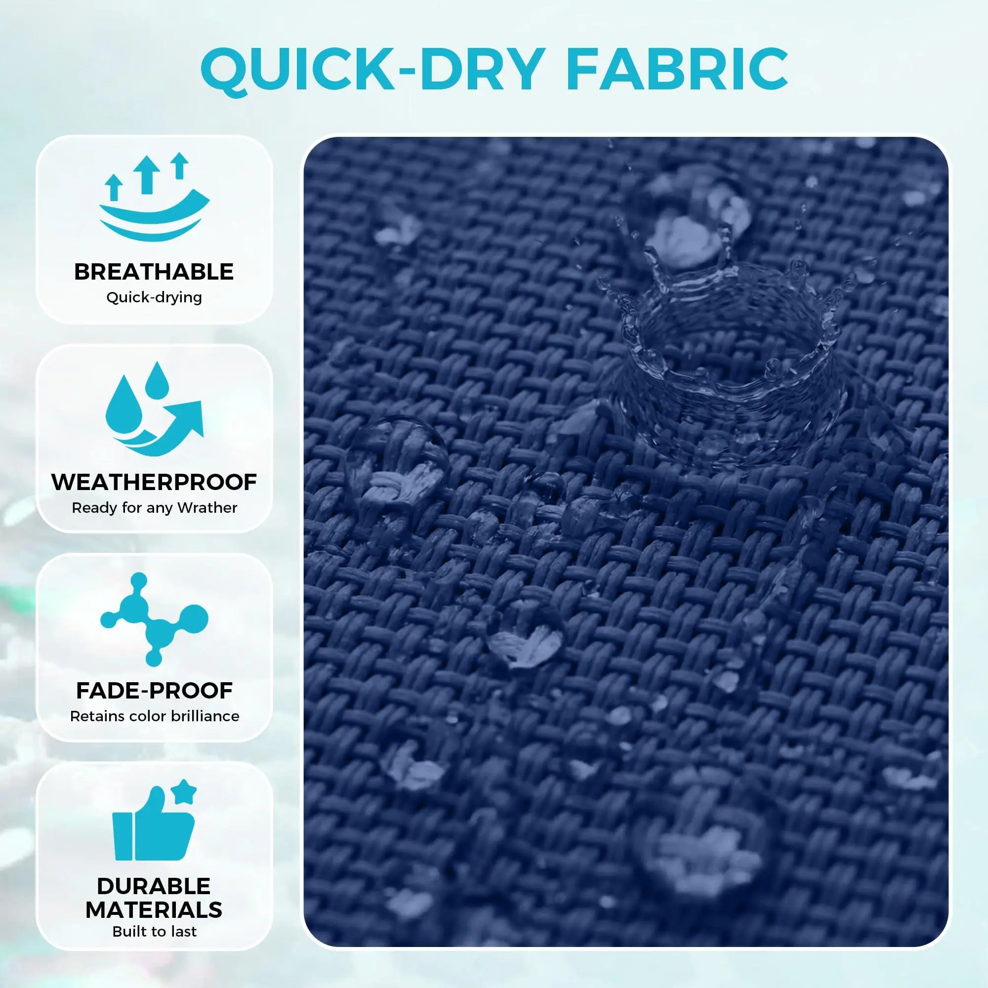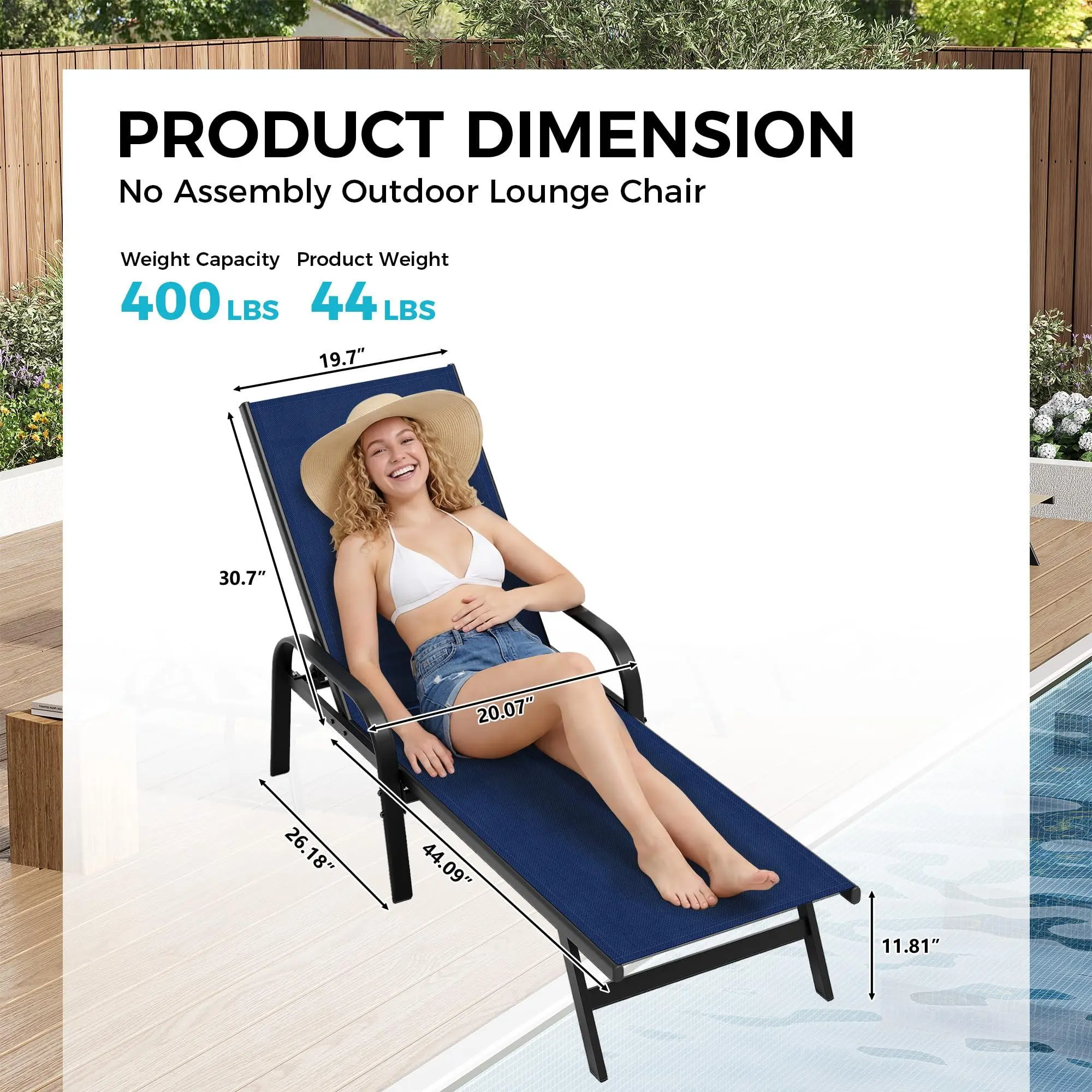 Equipped with Premium Textilene Fabric – The high-density Textilene mesh fabric is breathable, water-resistant, UV-resistant, and fade-resistant, providing reliable support and comfort for poolside chaise lounge chair use.