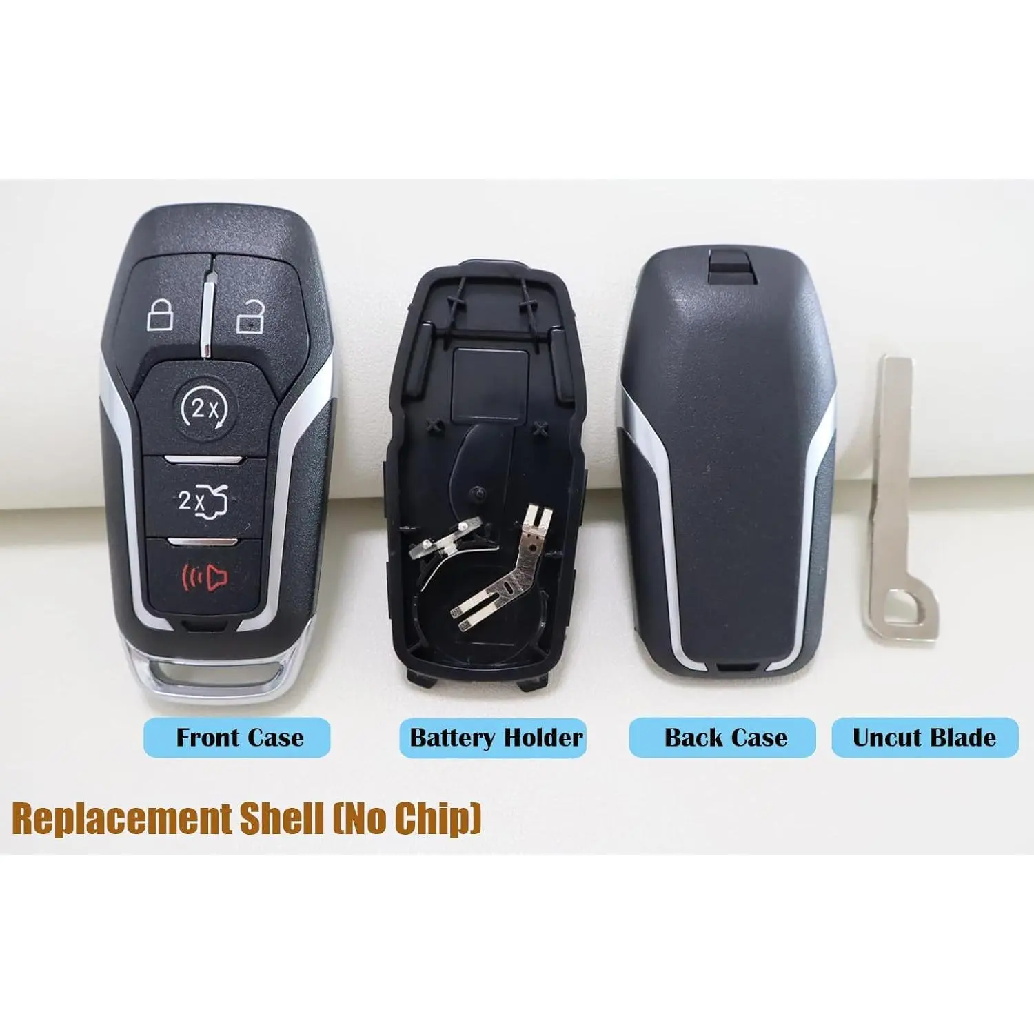 This key fob cover shell fits Ford models like Fusion, Explorer, Mustang, Edge, F150, F250, F350, and Lincoln MKZ, MKC. It's a replacement part without a circuit board or chip. The material is ABS Plastic + Metal, with an uncut key blade. Cut the blade after receiving it. Move internal components to the new key case. Perfect for Ford Escape, Edge, Explorer, Focus, and more.