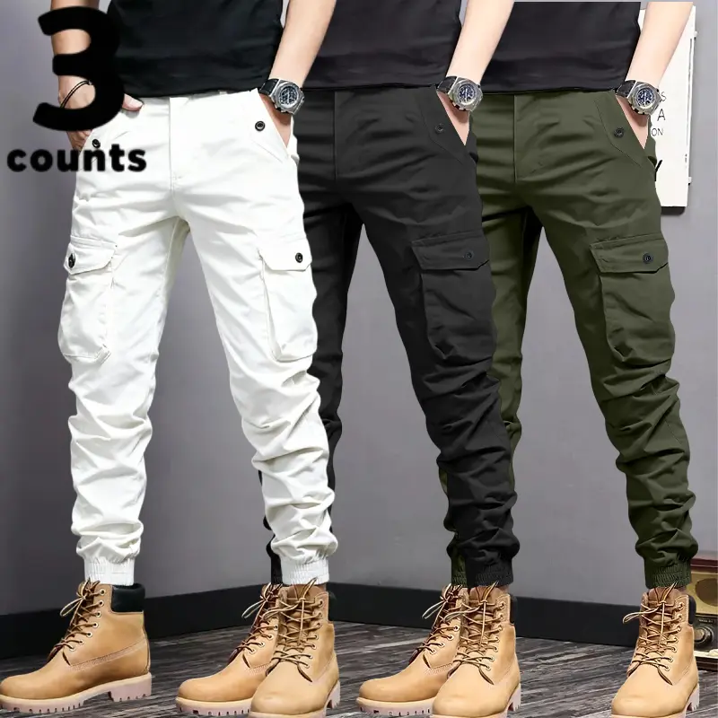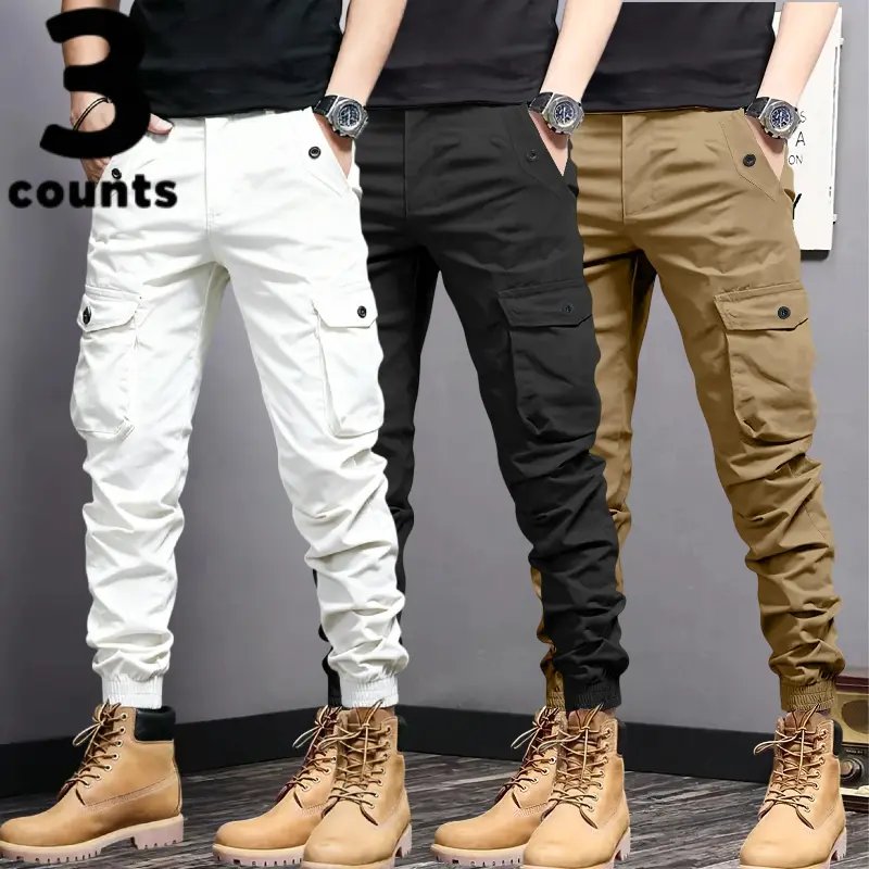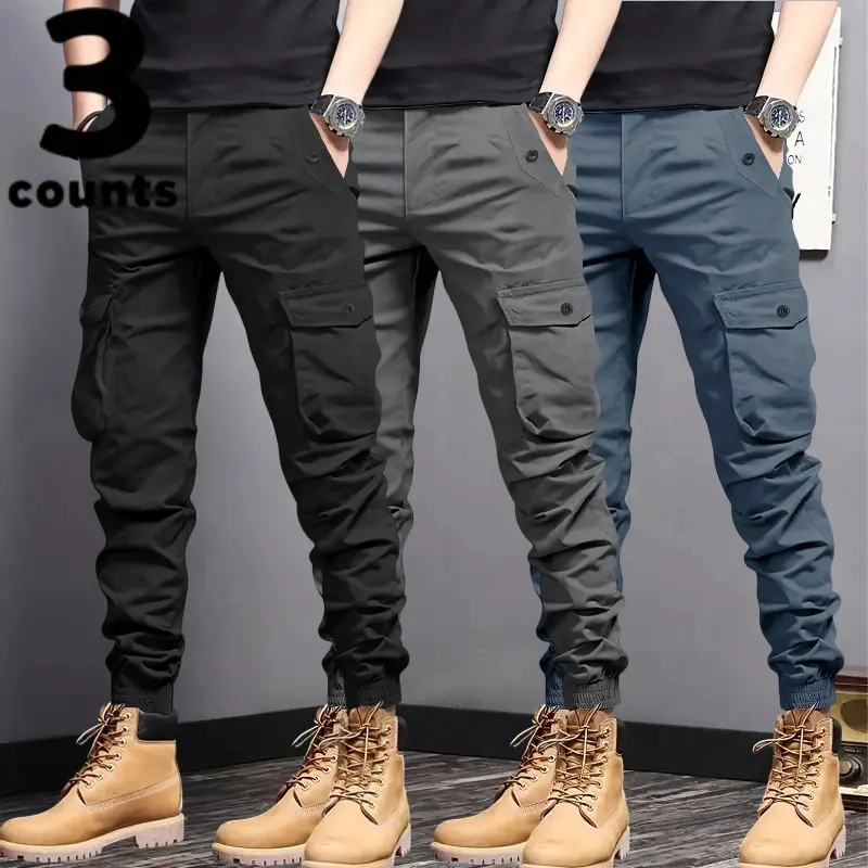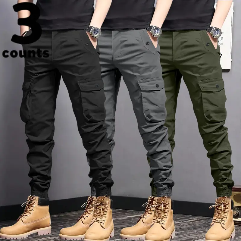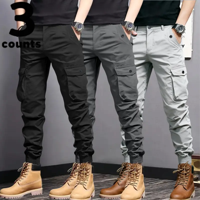 These men's cargo pants feature multi-pockets and tapered cuffs, making them ideal for various activities. The design includes durable, non-stretch material, ensuring longevity and reliability. Choose from three colors: black, gray, and beige. Each pair is crafted for practicality, with pockets for storage and tapered cuffs for a snug fit.