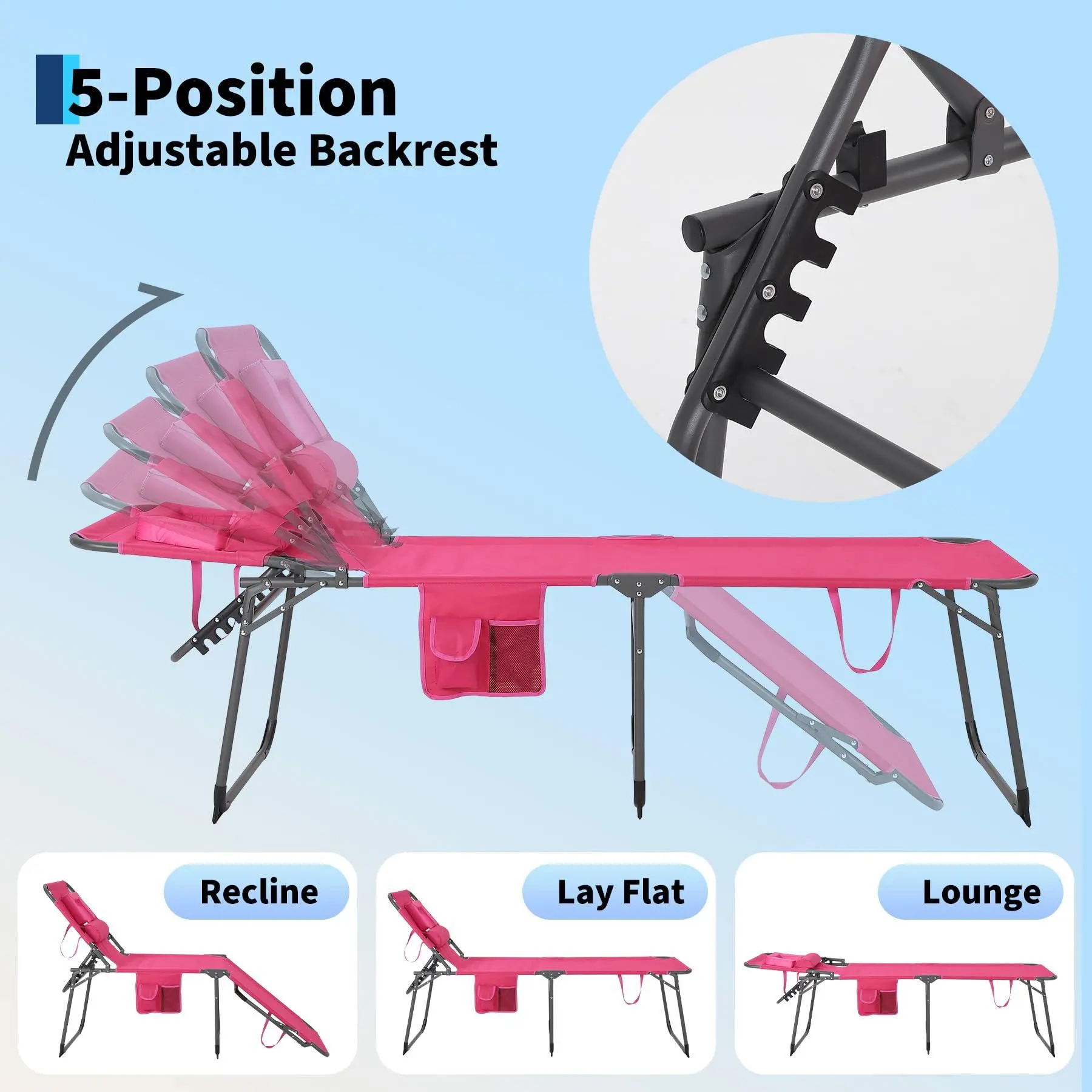 Thoughtful Multi-Functional Accessories:Sunbathing lounge chair detachable headrest enhances comfort, and the side mesh storage bags allow you to safely store your mobile phone, sunscreen, books, etc. within reach during your leisure time, without having to get up.