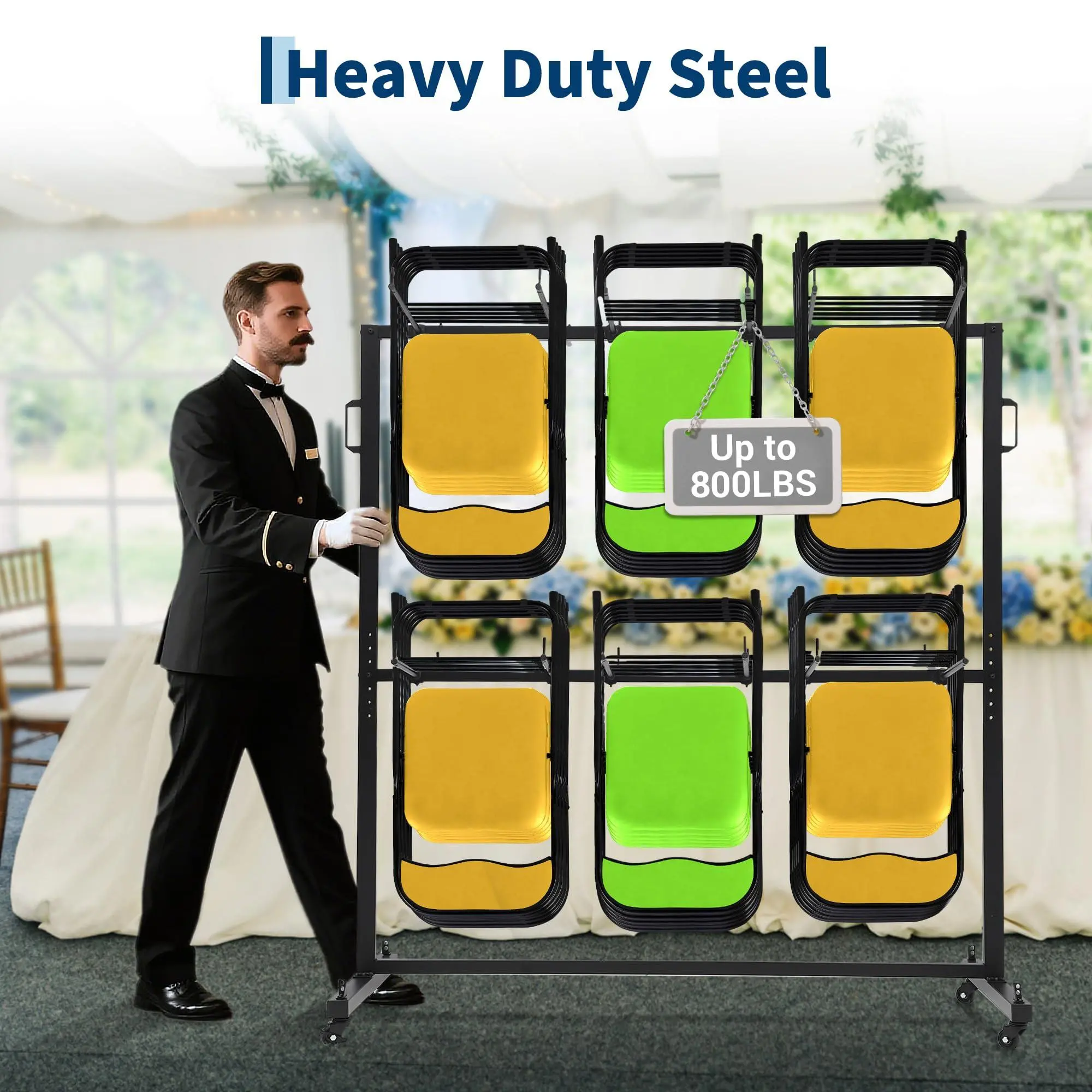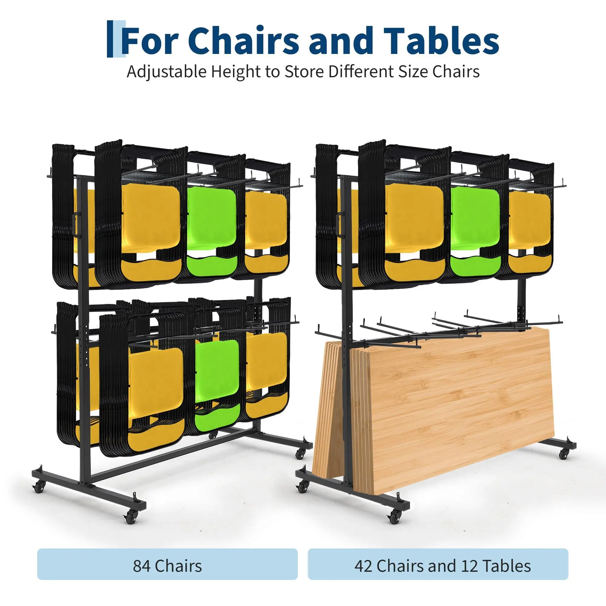Large Capacity: Holds 84 Chairs OR 12 Banquet Tables, This heavy-duty folding chair storage rack is the ultimate space-saving solution for venues, churches, schools, and event rentals. With an impressive 800-pound load capacity, it can store a full event's worth of chairs or tables securely on one easy-to-move cart.