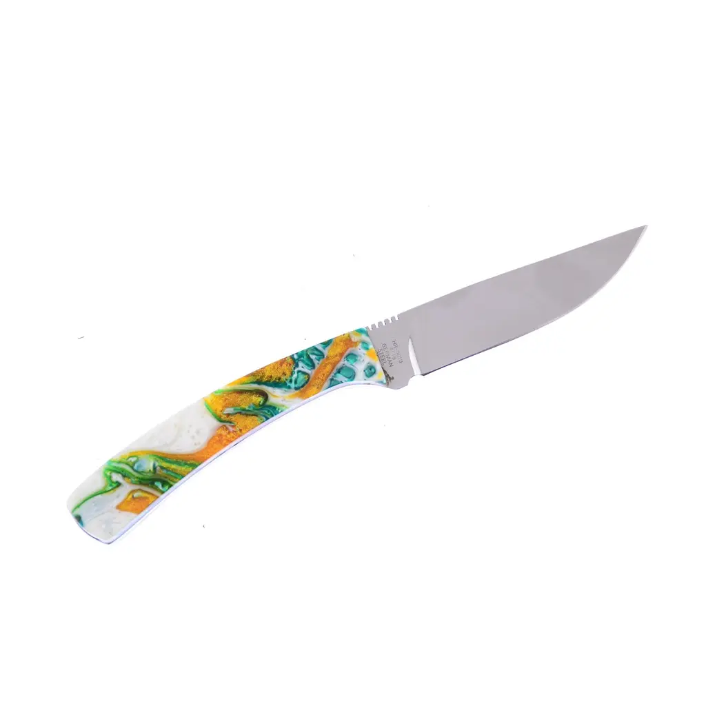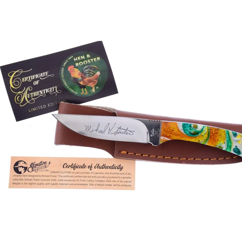 Micheal Prater Hen & Rooster Emerald River Skinner Custom Fixed Blade with Corelon Handle, German Stainless Steel, Durable Handle Material