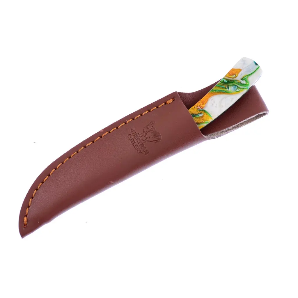 This hen & rooster micheal prater custom is a genuine hand poured corelon handle. Each handle shows up different from the others, but it all consist of the same colors. This fixed blade is full tang construction made of german stainless steel. It is great for collectors to put up in a display, or for everyday carry. Corelon is a durable handle material that makes it where you can actually use it as your everyday carry. This specific color way is called emerald river.