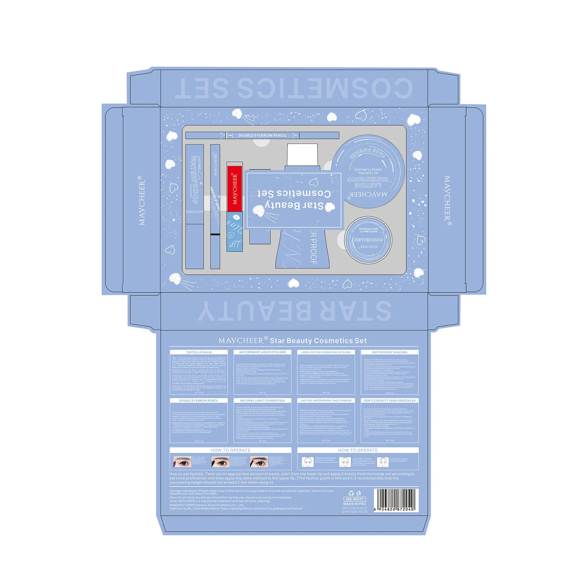 MAYCHEER Heart-to-Heart Beauty Makeup Set: Lipstick, Lip Gloss, Eyeliner, Eyebrow Pencil, Foundation, Powder Set