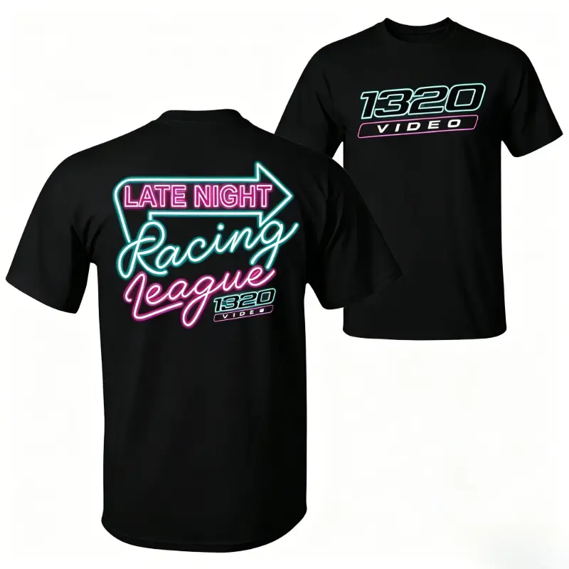 Retro Video Racing Neon Light Graphic T-Shirt, Vintage Late Night Racing League Theme Print 100% Cotton Soft Crew Neck Tee, Men's Sport Streetwear Top, Stylish & Comfortable Casual Wear for Car Enthusiasts and Racing Fans