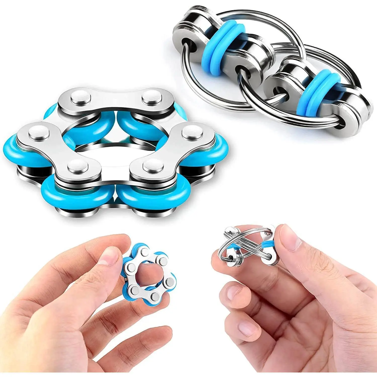 Durable silicone rings & rust resistant metal parts ensure the fidget toys will be long lasting. The six roller chain with rolling silicone ring will not be eroded by hand sweat. Both kids and adults can use the stress reducer set.