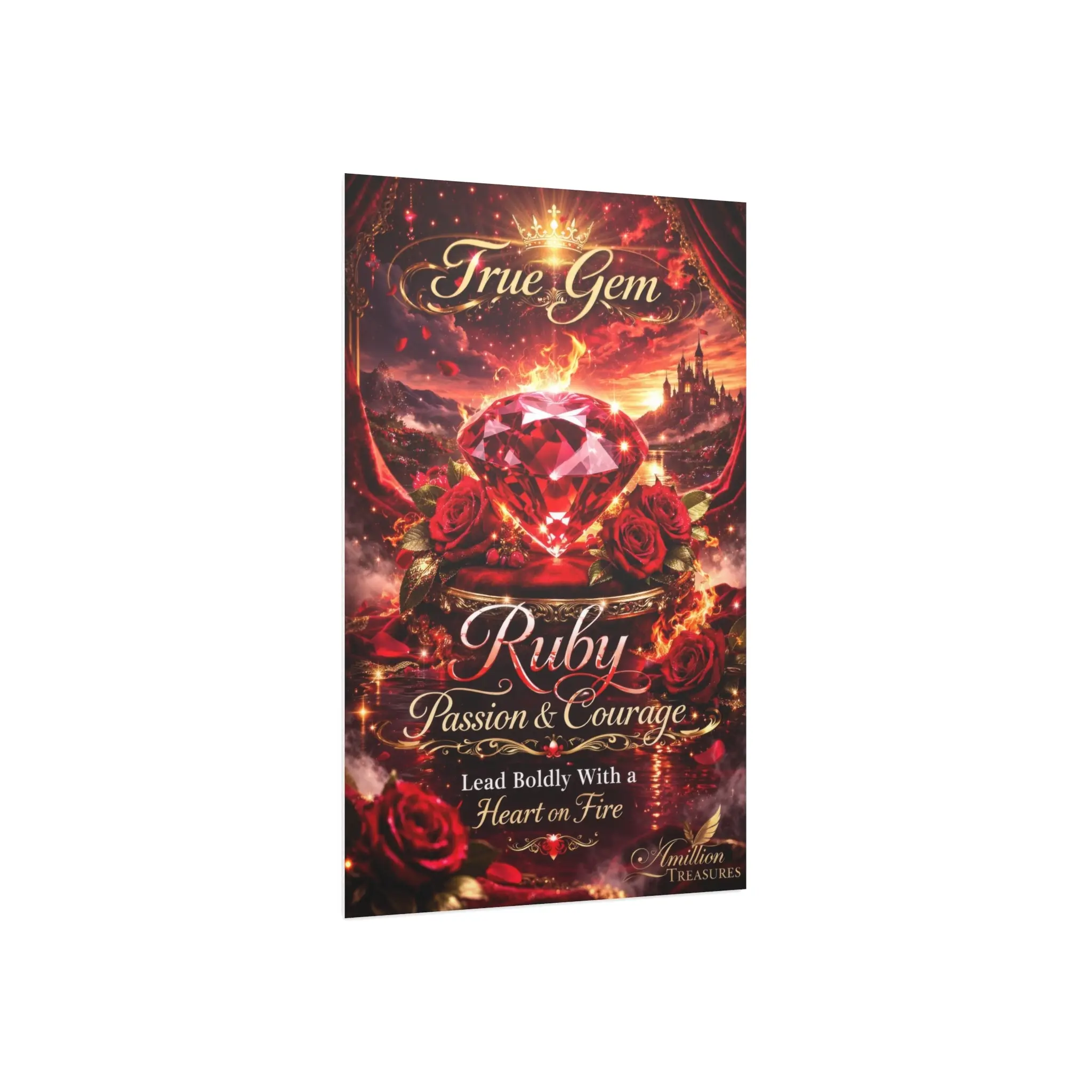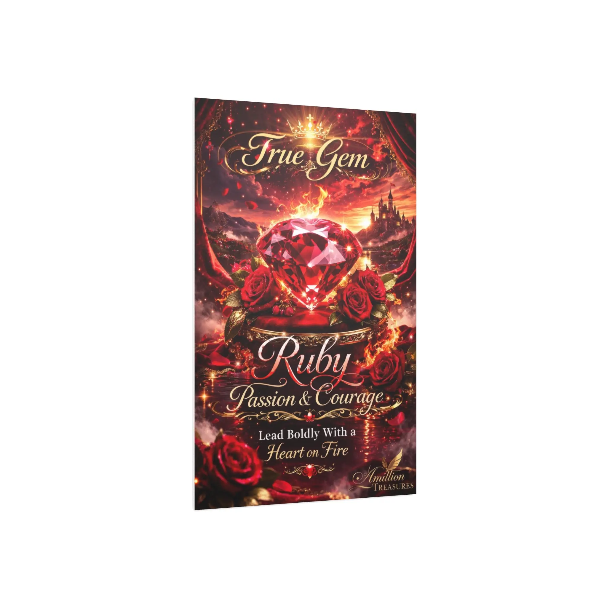 Behind the ruby rests the vision of a Kingdom, symbolic of inheritance, purpose, and authority that cannot be taken. Around it, flames move like living energy, representing refinement, endurance, and spiritual transformation. Soft roses weave through the heat, reminding you that beauty still grows in places where fire has passed.
