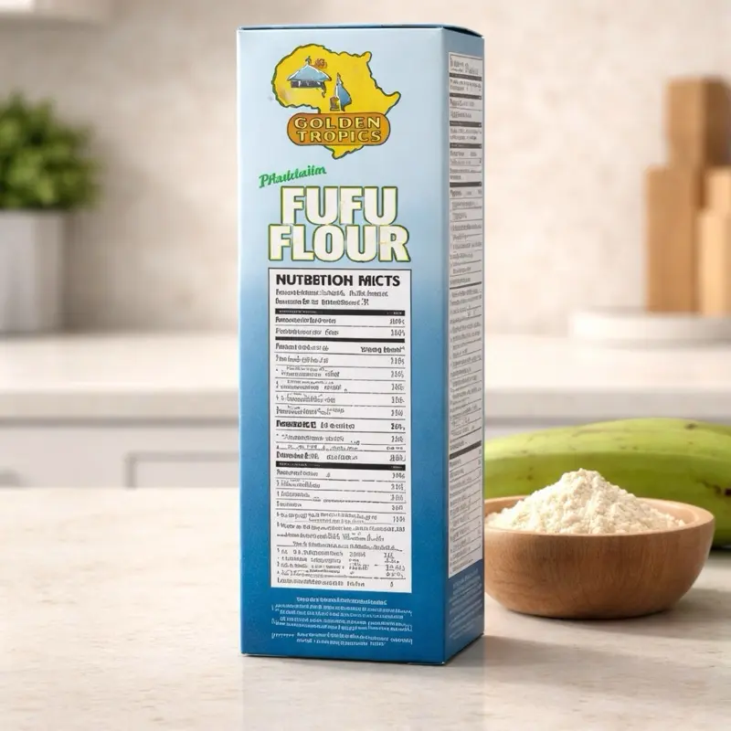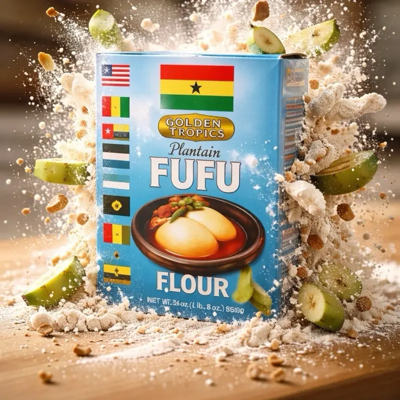 Key Ingredients (Golden Tropics Plantain Fufu): Plantain: Provides the base flavor and texture. Cassava (Yuca): Adds essential starch for elasticity. Potato Granules & Starch: Used to create a smooth, lump-free texture. FD&C Yellow No. 5: Often added for color. Preservatives/Additives: Typically includes Sodium Bisulfite and BHT to maintain freshness.