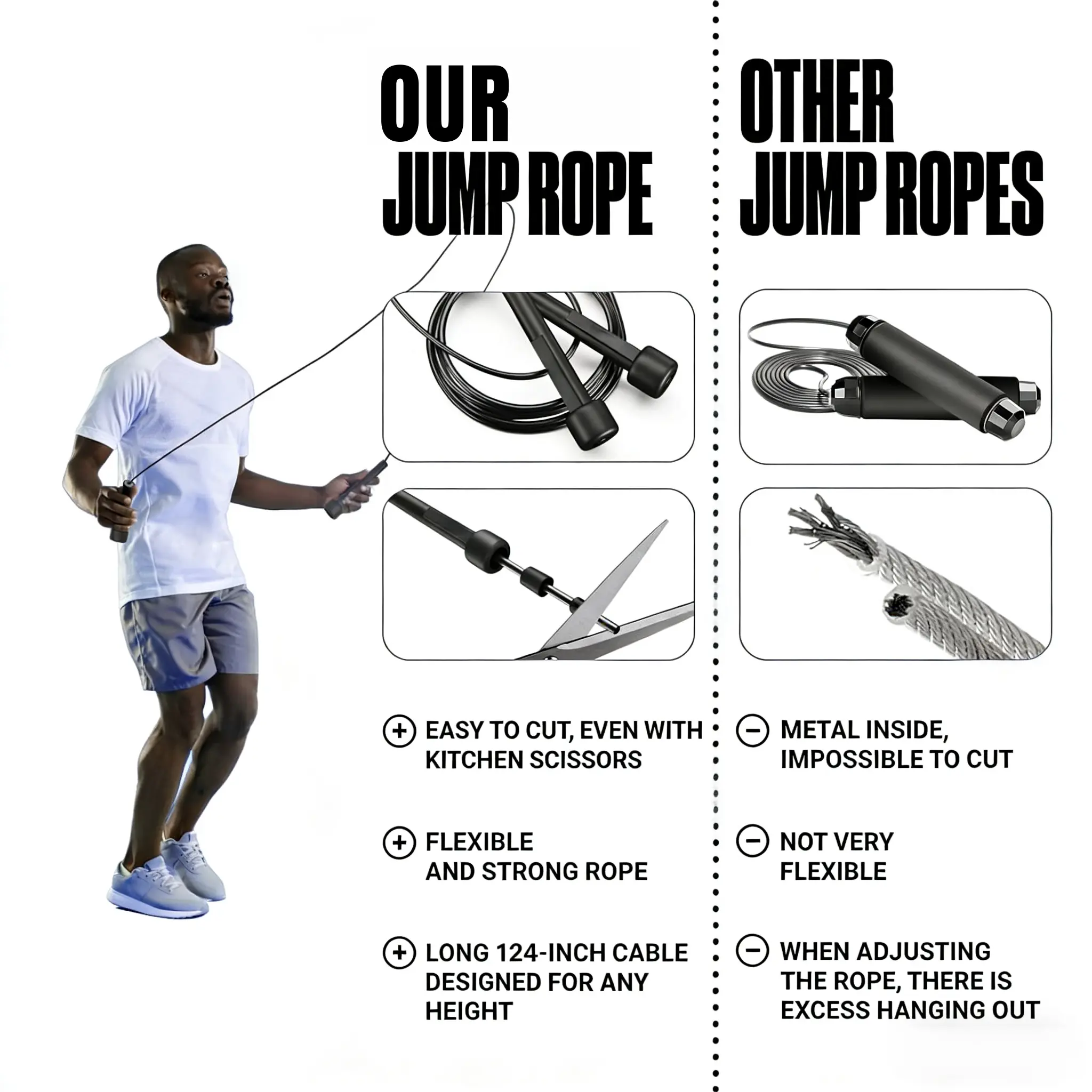 【Adjustable & Customizable Fit】 This jump rope is easy to cut and adjust with regular kitchen scissors. With a 124-inch extra-long cable, it fits users of all heights perfectly. No internal wires or metal parts ensure safe, hassle-free use for the whole family.
