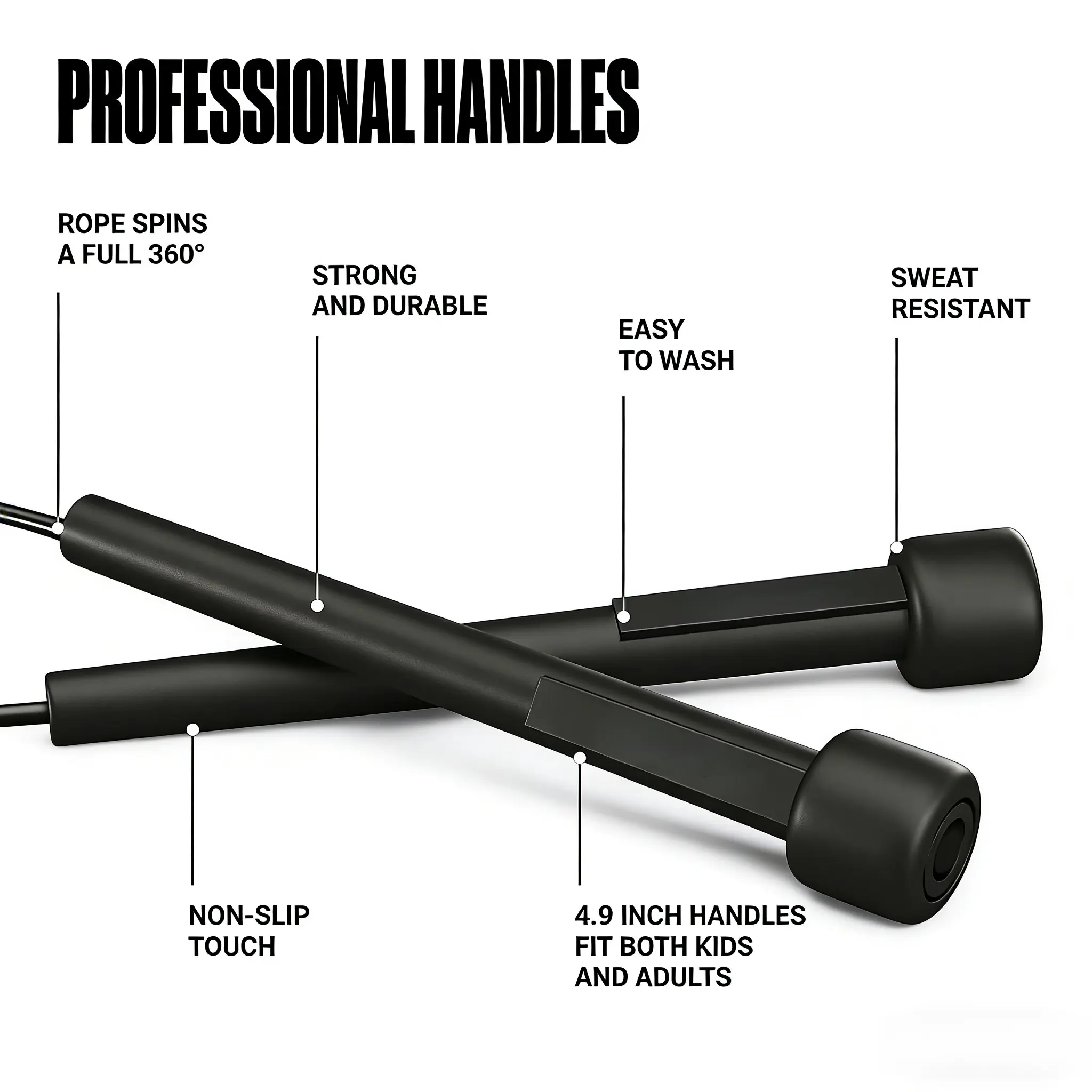 【Durable & Smooth Performance】 Made of high-quality flexible PVC, this speed rope is tear-resistant and built to last. The 360° rotating handles deliver ultra-smooth rotation, making it ideal for both beginners and professional athletes. 【Comfortable & Sweat-Resistant Handles】 Ergonomically designed 4.9-inch PP handles feature a non-slip grip, perfect for long workouts. They are easy to clean, sweat-resistant, and fit both adult and kids' hands comfortably.