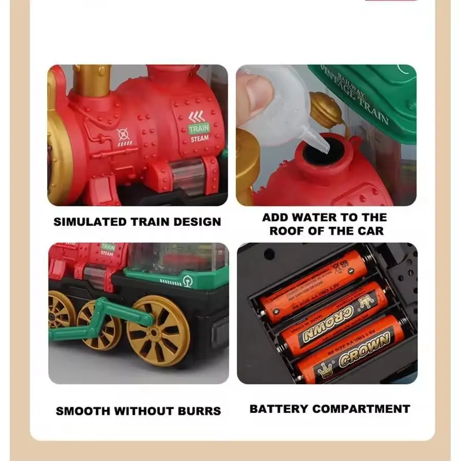 Key Features: Realistic Design: This vintage steam train toy features a classic design with intricate details, including a water filler on the roof and a smooth, burr-free finish.