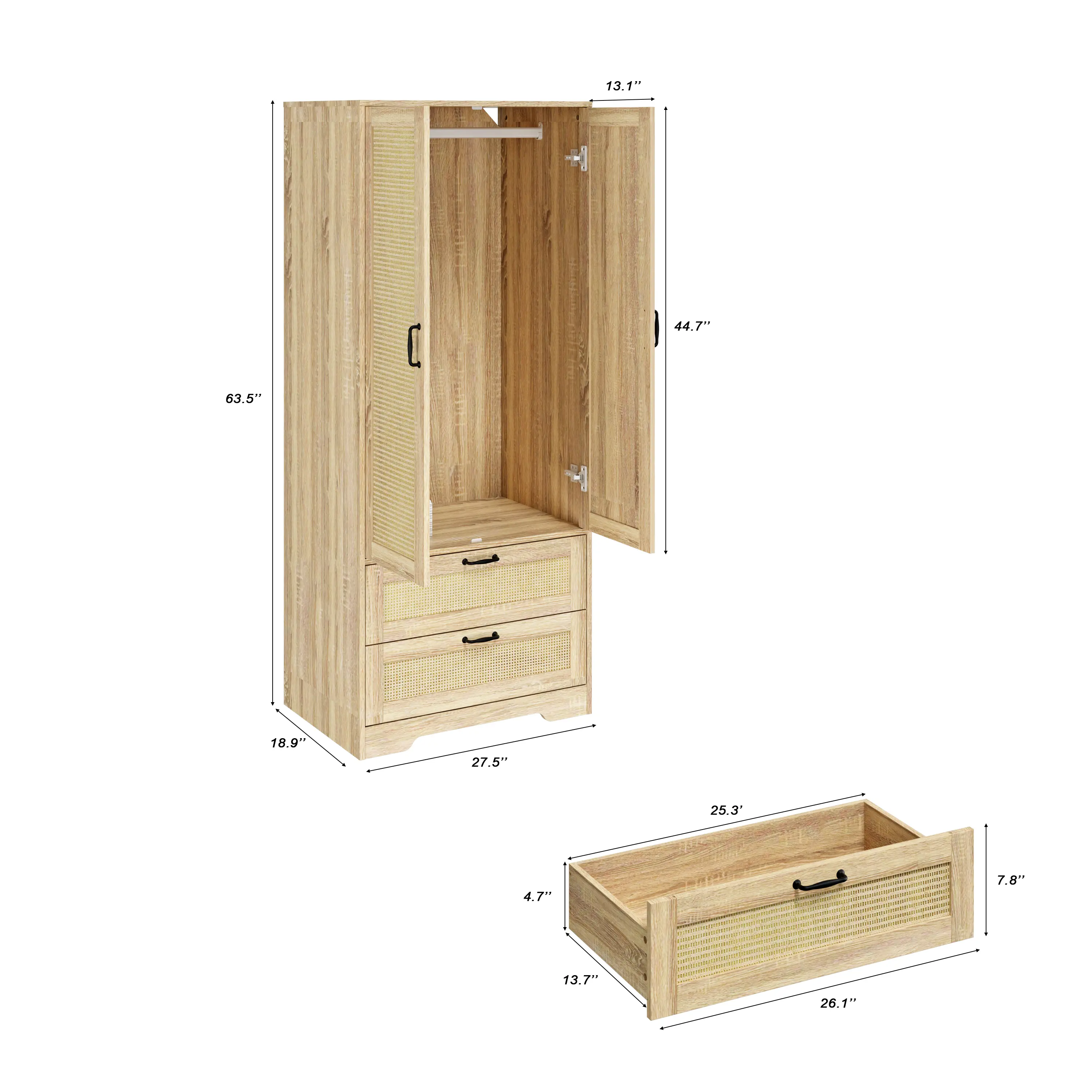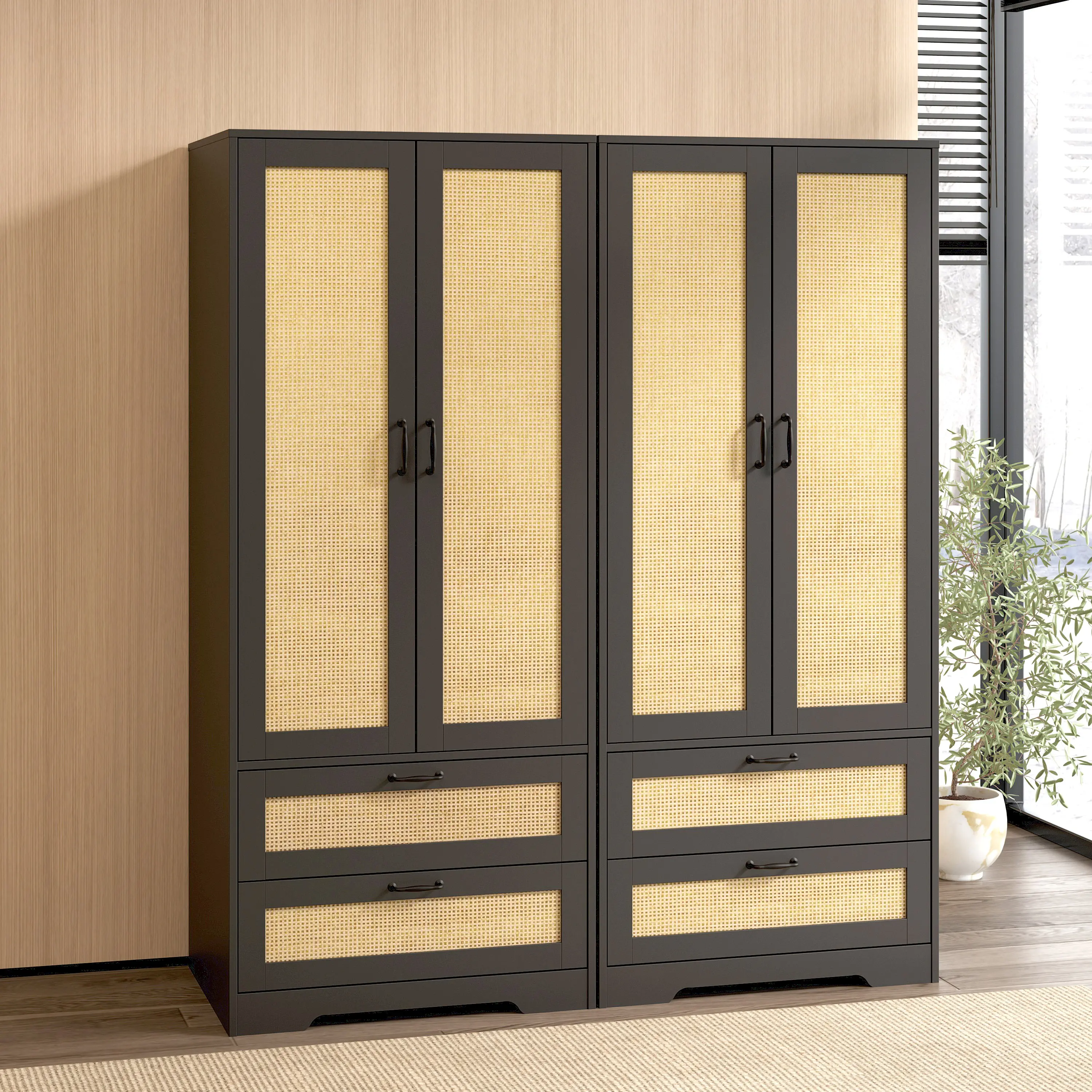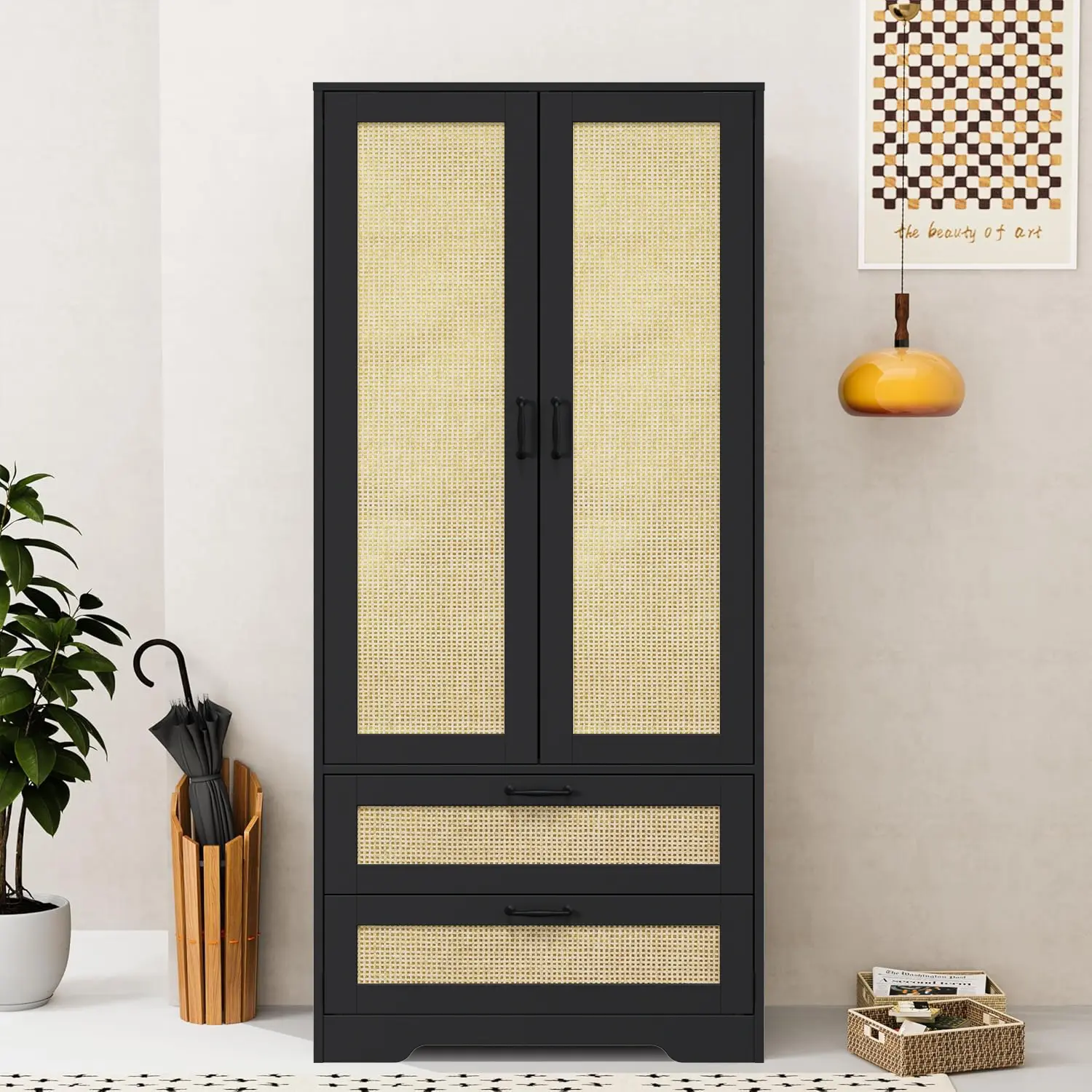 Wooden Wardrobes With Hanging Rods Freestanding Modern Clothing Storage Cabinets With 2 Rattan Doors & Drawers In Black White Natural Colors For Bedroom Living Room Laundry Cloakroom