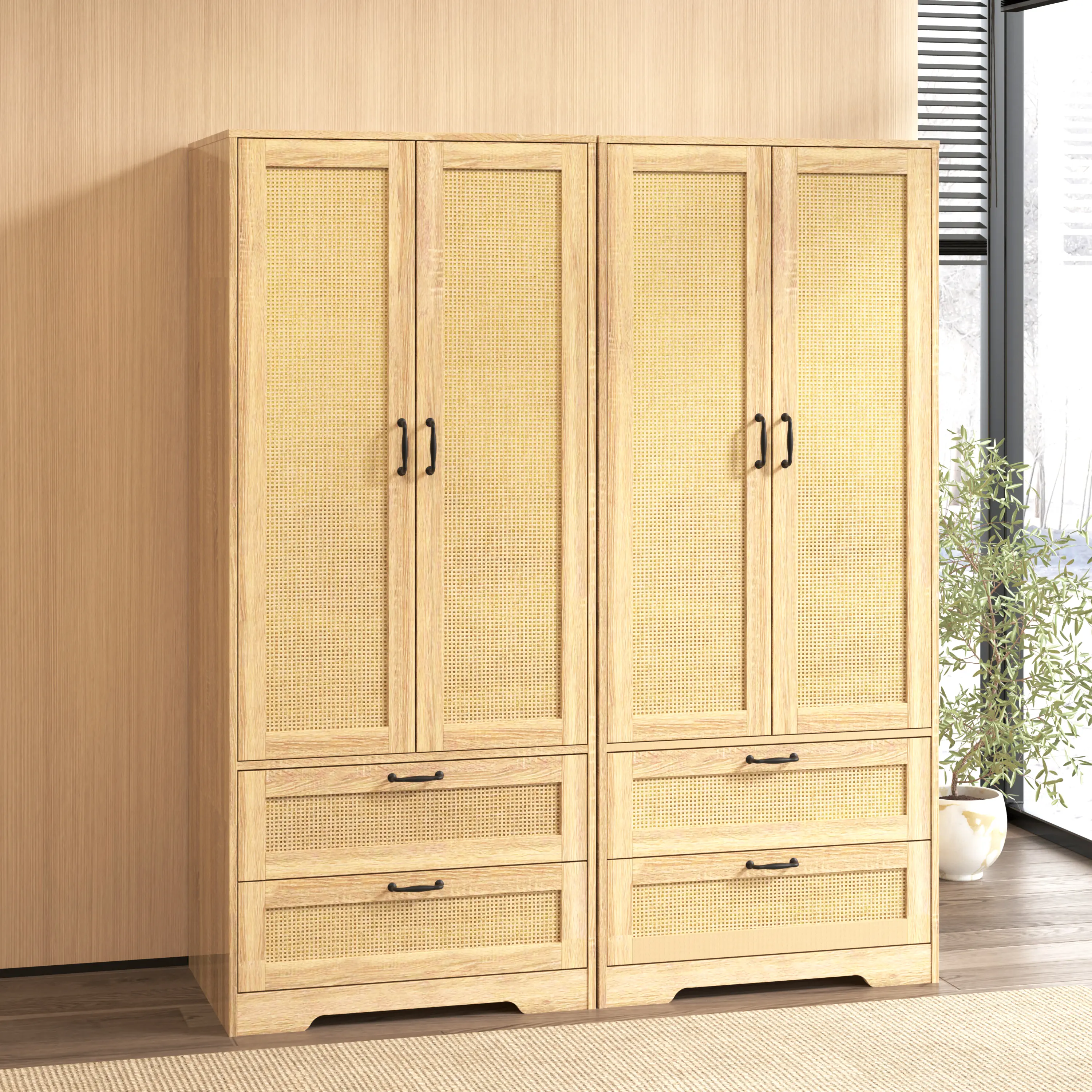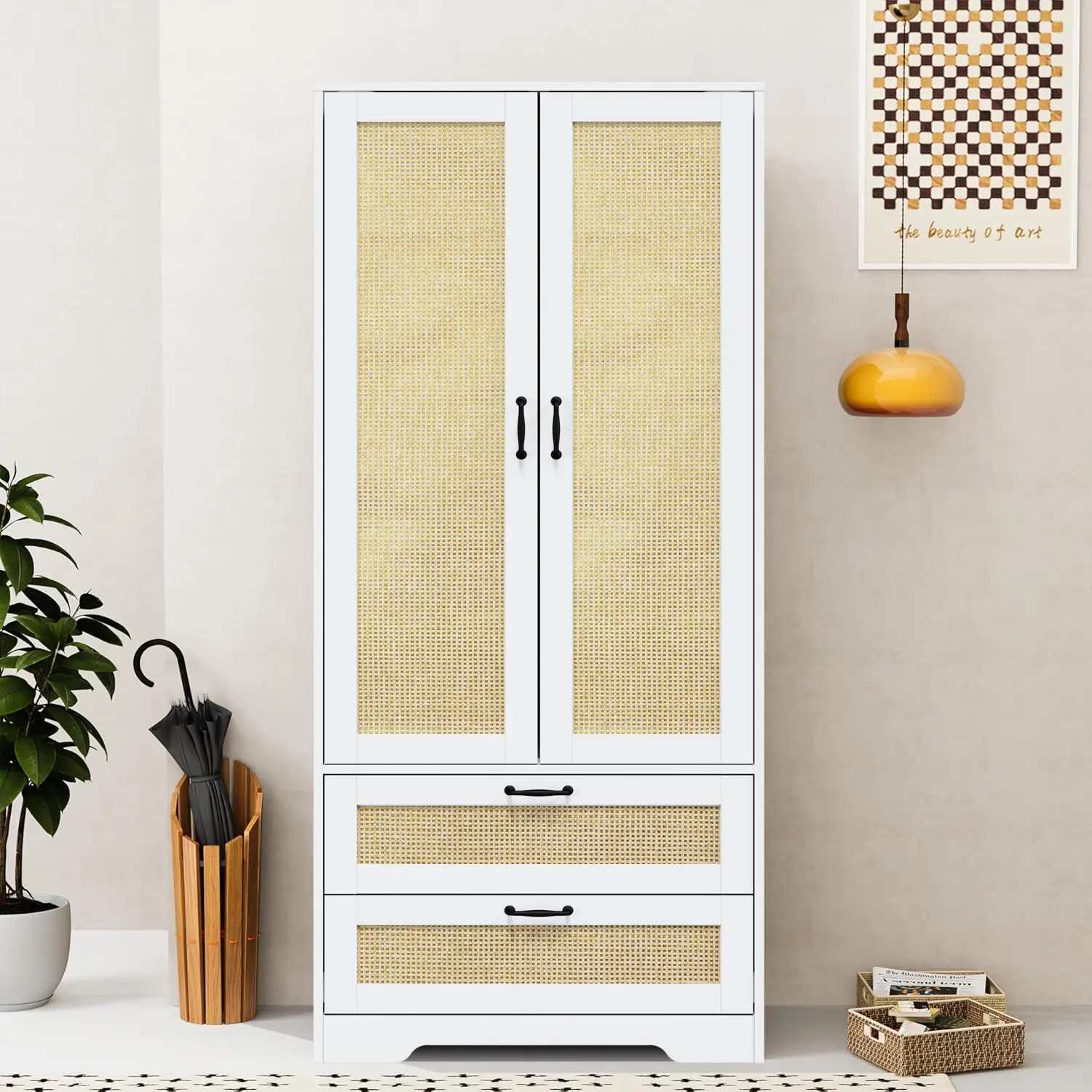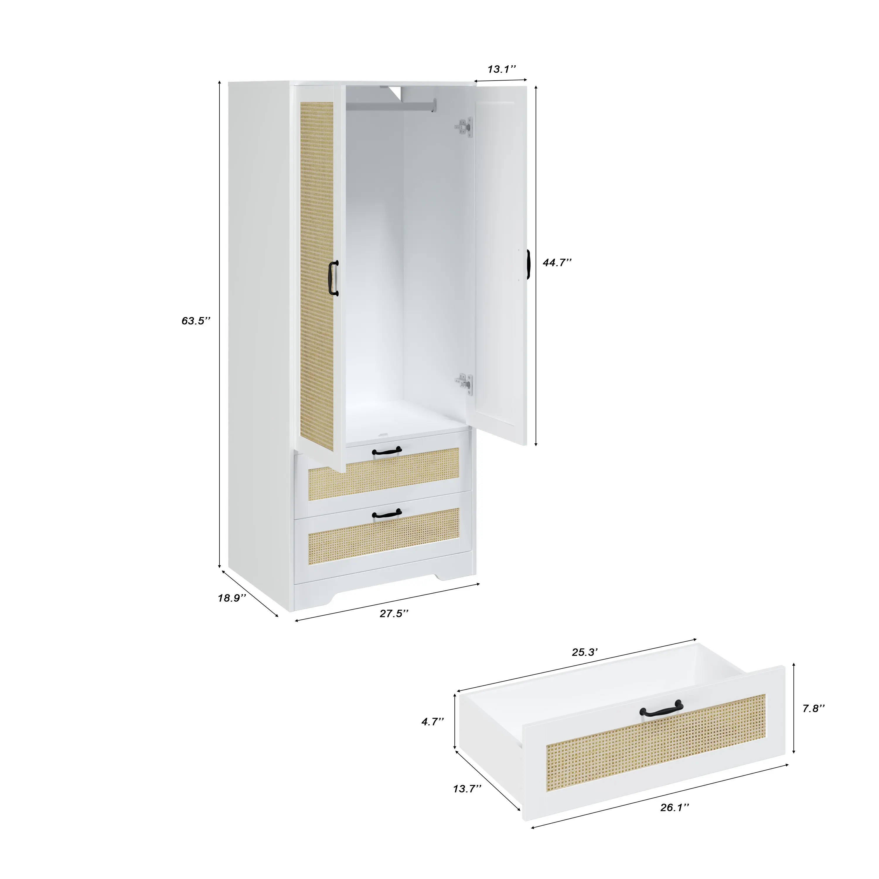 Wooden Wardrobes With Hanging Rods Freestanding Modern Clothing Storage Cabinets With 2 Rattan Doors & Drawers In Black White Natural Colors For Bedroom Living Room Laundry Cloakroom