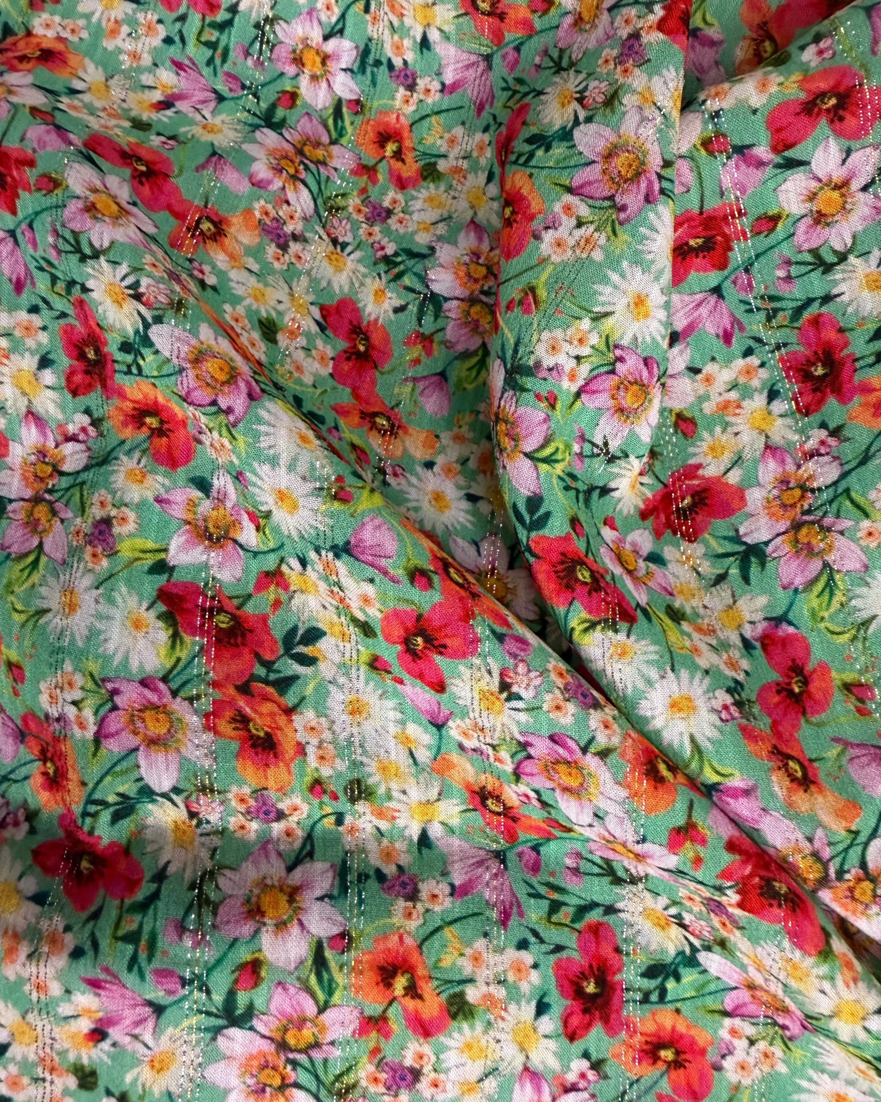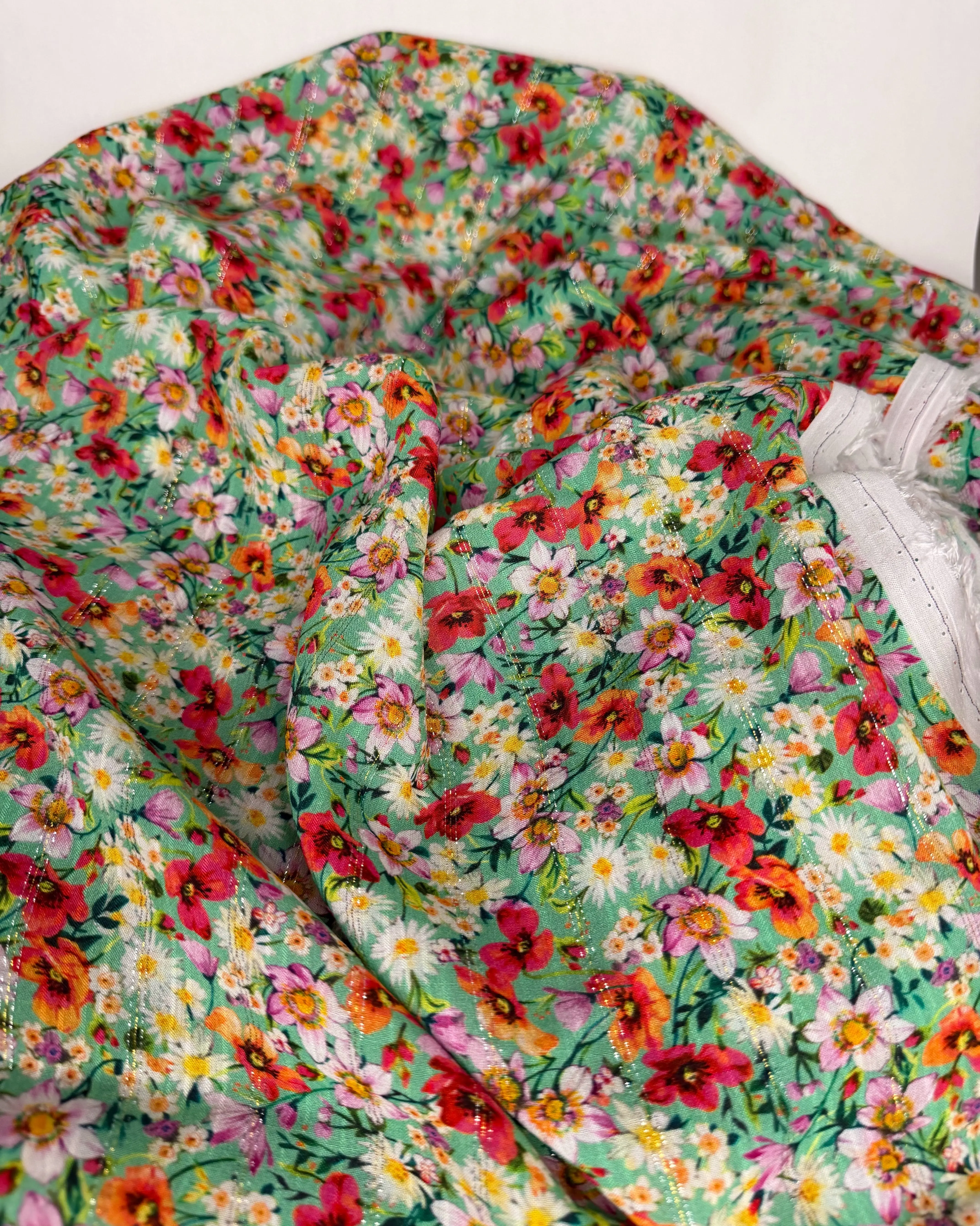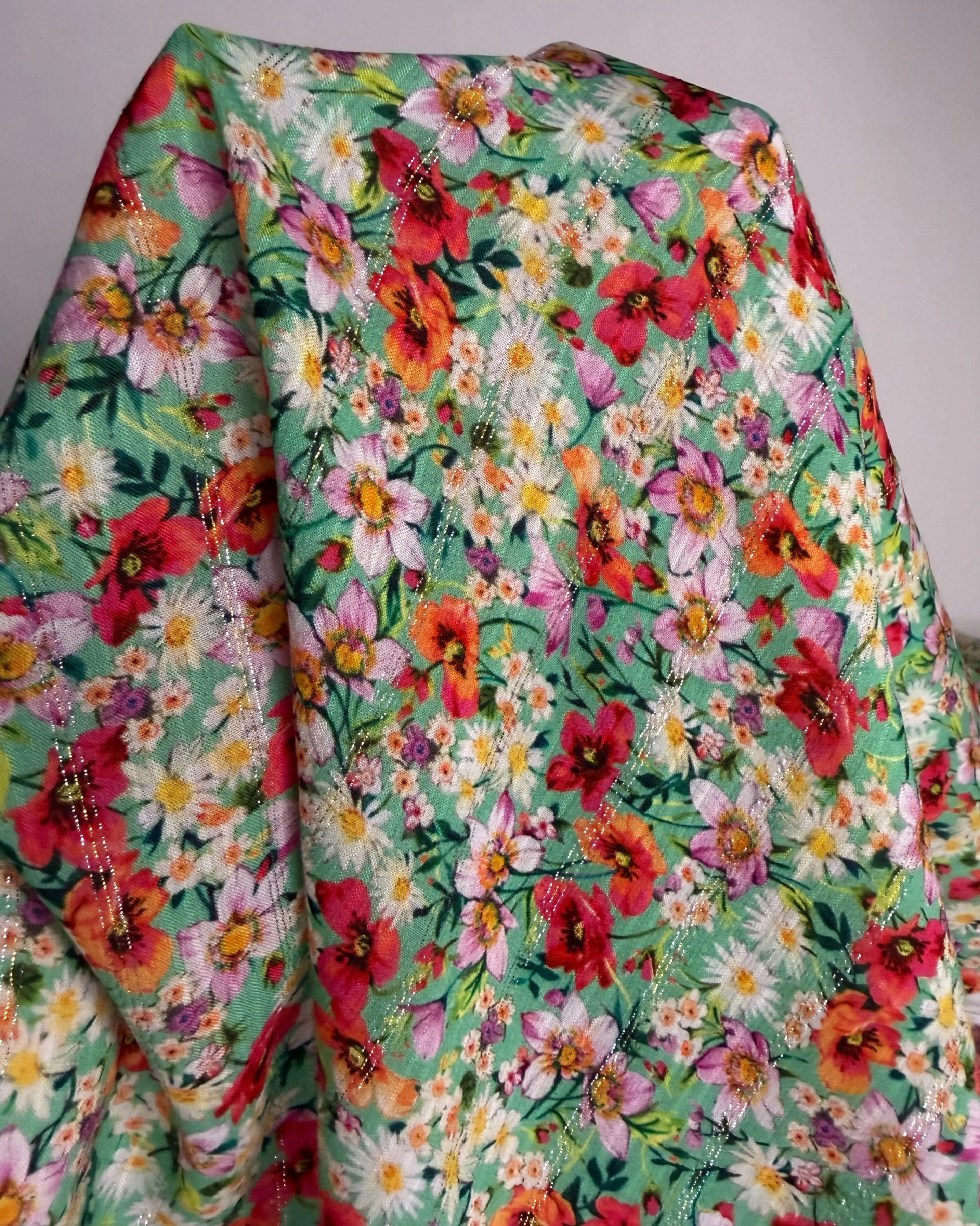This elegant light crepe viscose fabric is crafted from 90% viscose and 10% lurex, offering a soft, fluid drape with breathable comfort. Fine lurex threads run throughout, adding a subtle line of sparkle that catches the light beautifully. The fresh green floral print brings a lively, feminine touch, while the fabric itself remains opaque, making it easy to wear and versatile for many garment types. Perfect for dresses, blouses, skirts, and pieces that call for effortless movement with a hint of shimmer. Sourced in Italy