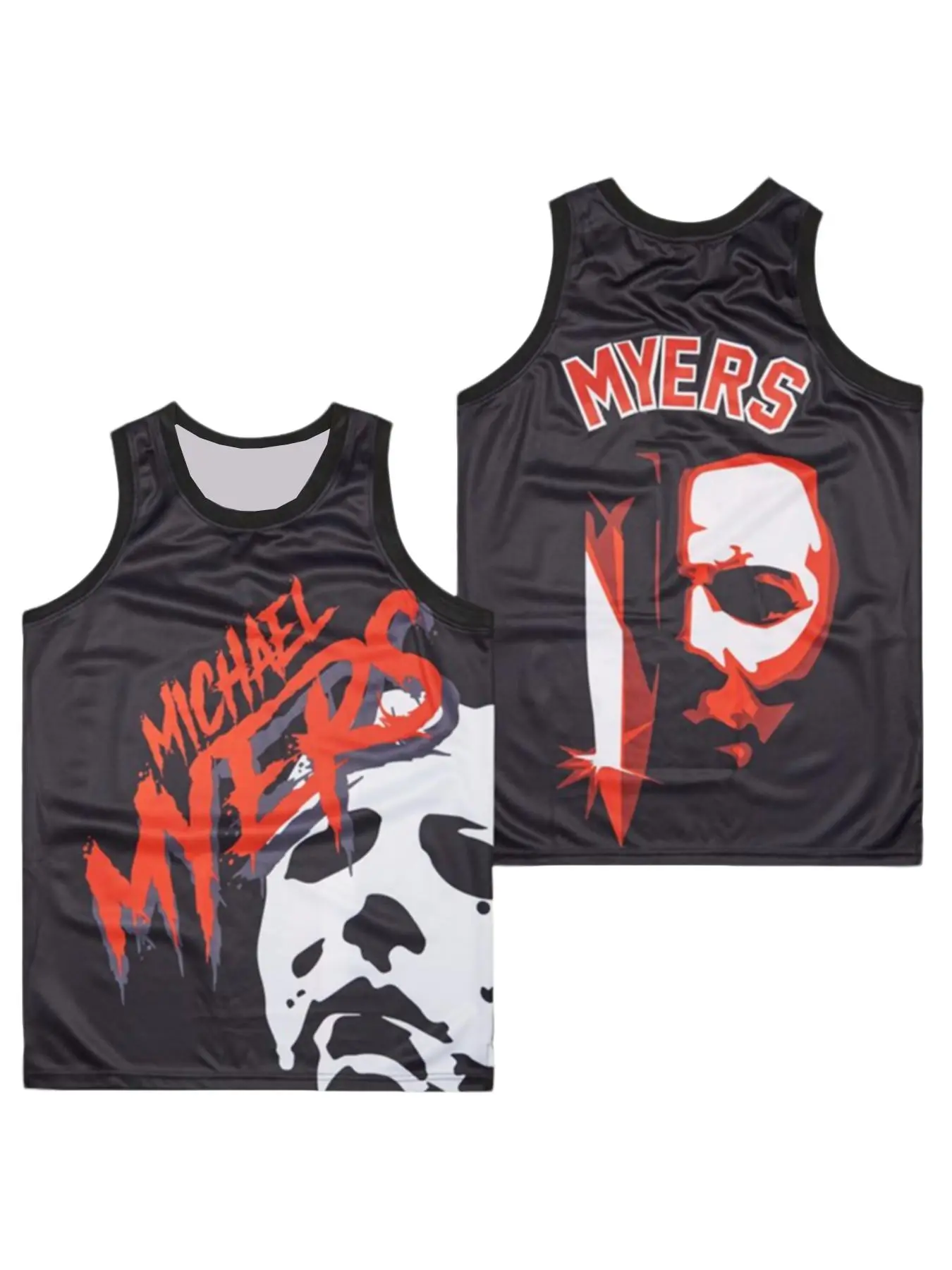 Michael Myers Halloween Basketball Jersey Black Red White Horror Movie Print All Over Print Breathable Mesh Sleeveless Tank Top for Horror Fans, Halloween Enthusiasts, Basketball Collectors & Movie Lovers