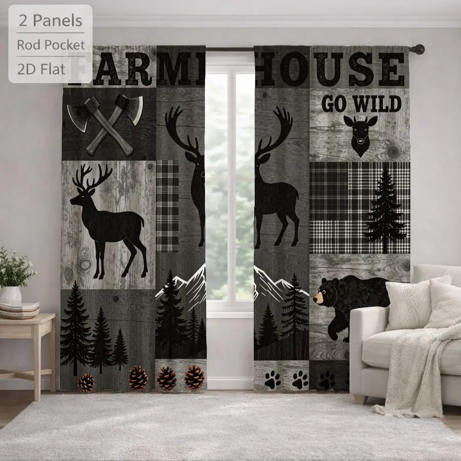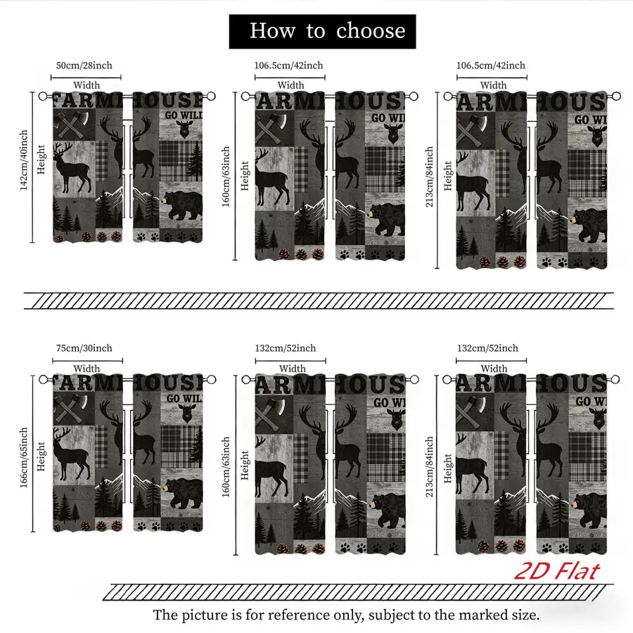 2Pcs Rustic Woodland Animal Deer Bear Plaid Patchwork Sun Blocking Curtains Digital Printed Rod Pocket, Window Treatment For Bedroom Office Kitchen Living Room Study Home Decor