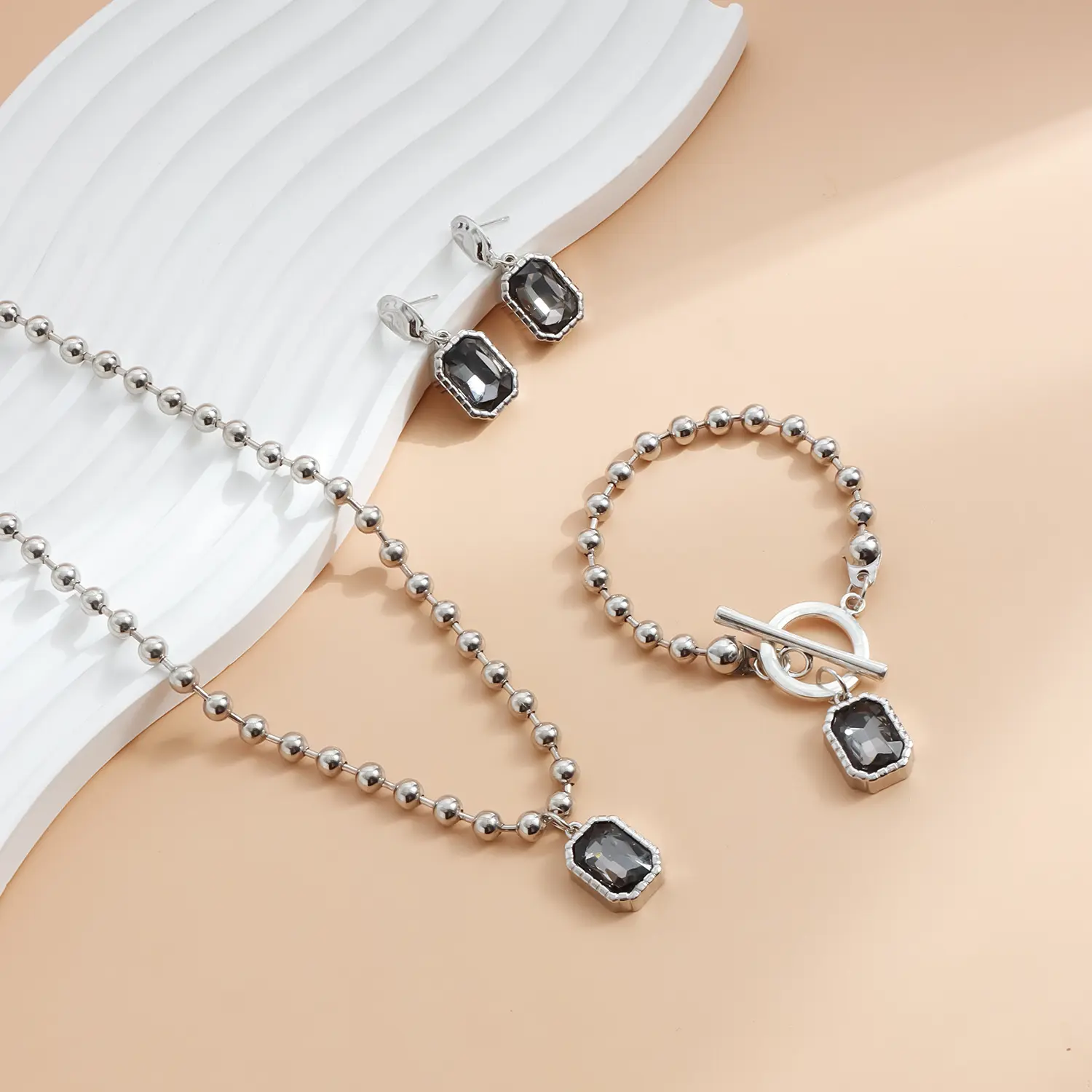 This collarbone-length necklace features a silver-tone beaded ball chain paired with a geometric rectangular black crystal pendant.Designed to be worn as a standalone focal piece or paired with matching accessories, this versatile necklace adapts easily to different dress codes and environments.