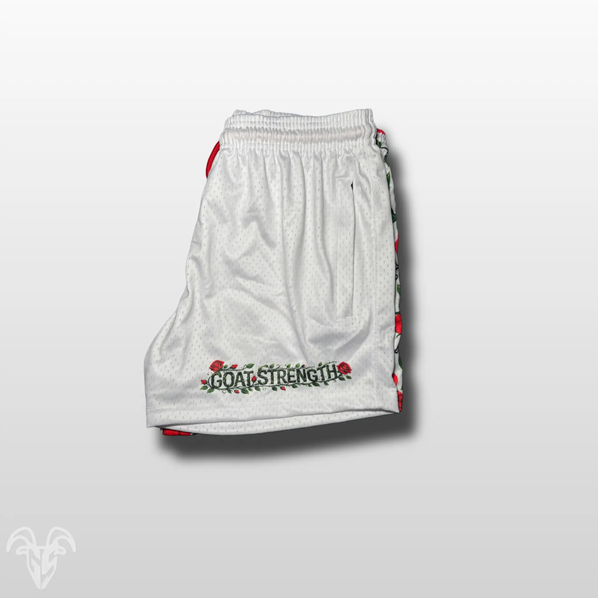 Goat Strength Split Rose Mesh Shorts combine bold contrast and clean design with performance comfort. Featuring a half-and-half layout with detailed red rose graphics on one side and a clean white mesh on the other, these shorts bring a unique look while staying lightweight, breathable, and built for movement.