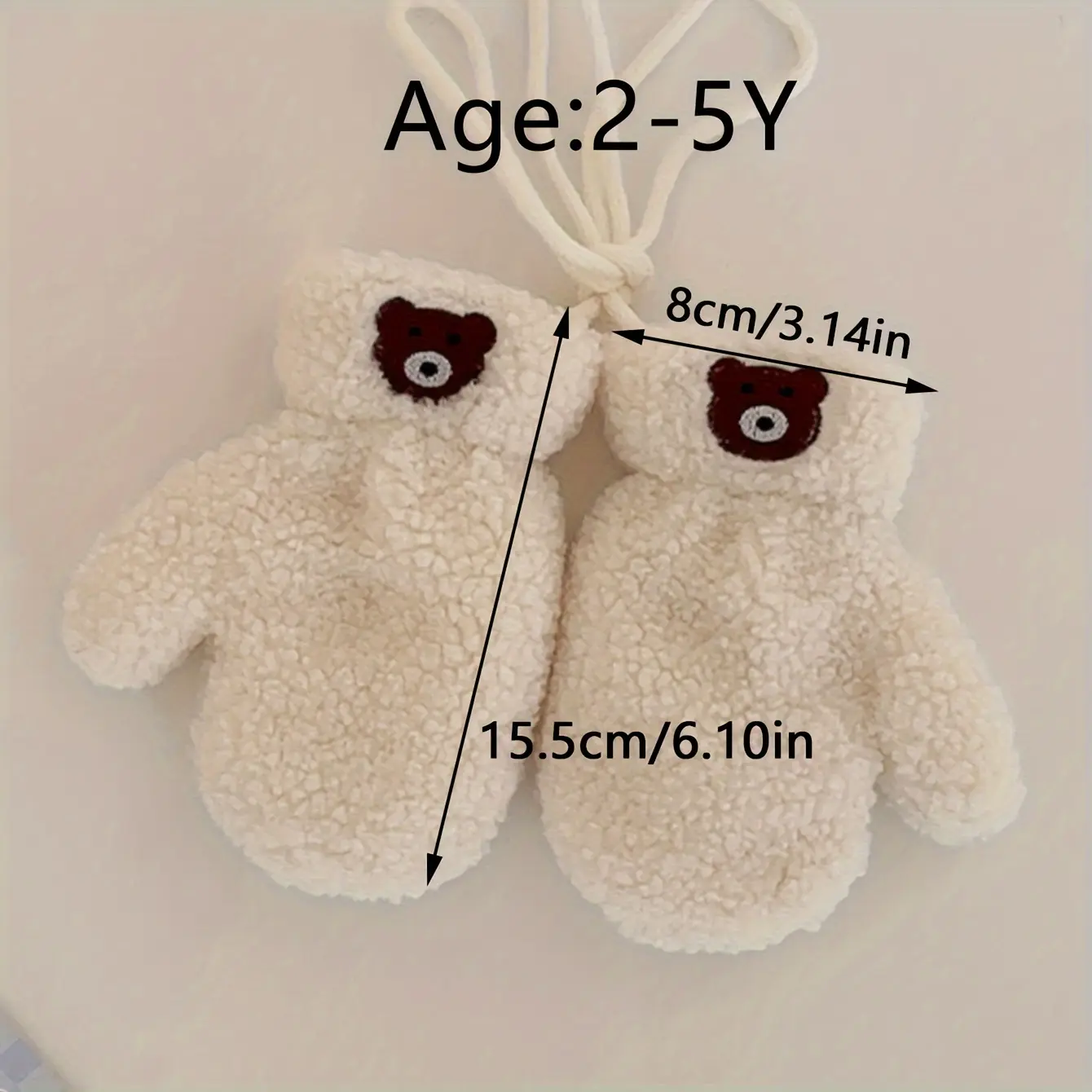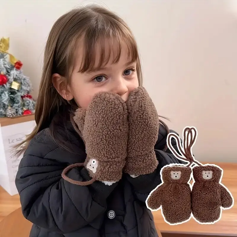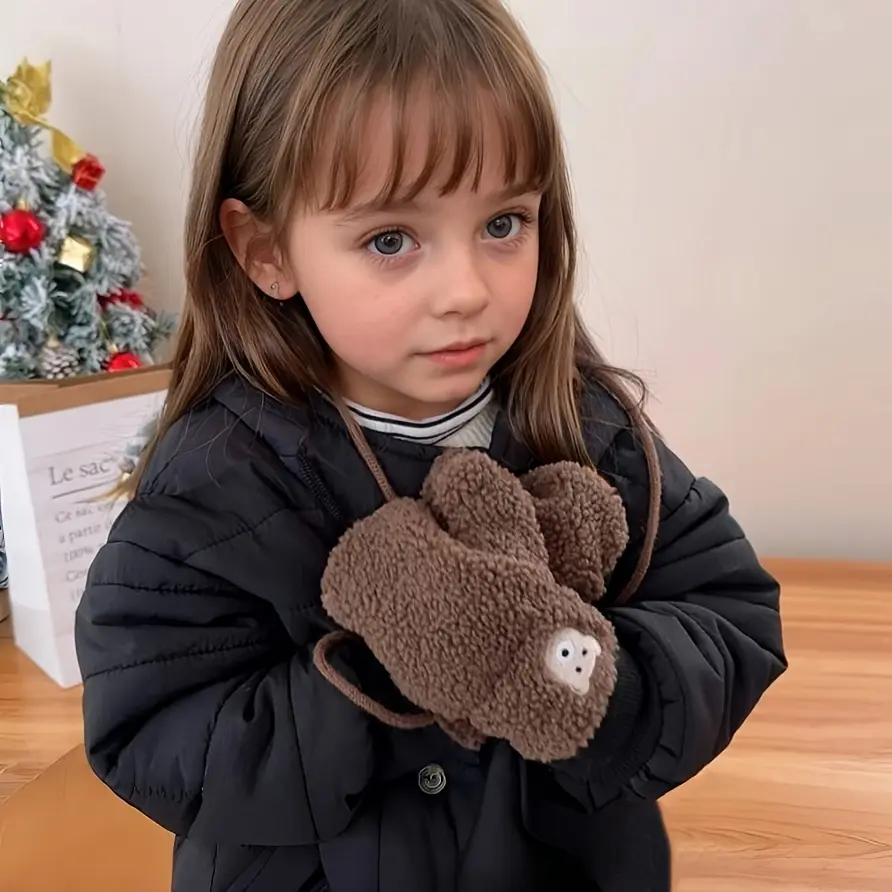 Kids Plush Winter Gloves with Neck Hanging Loop - Thick Warm Thermal Mittens for Boys & Girls 2-5 Years, Soft Brown/Beige/Gray/Black, Cozy Everyday & Play, Easy On/Off Design, Ideal for Christmas & New Year's Gifts, Adorable Plush Material for Boys & Girl