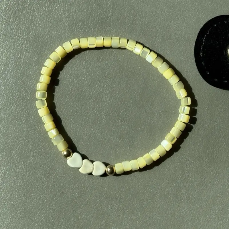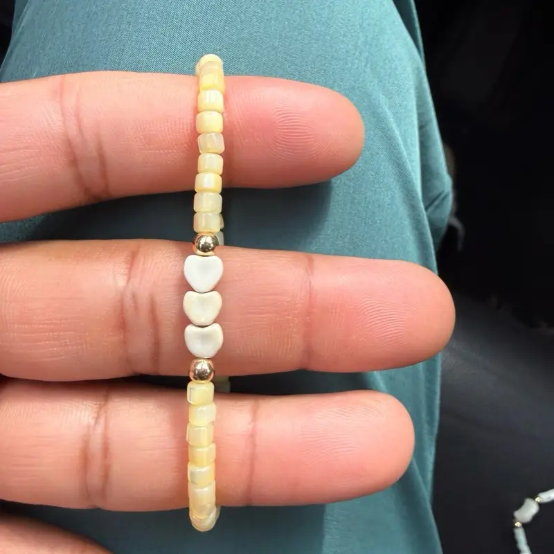 Sweet, soft, and subtly luminous, this dainty handmade bracelet features creamy yellow mother of pearl heishi (tile) beads with a gentle iridescent glow. Three small white heart charms sit nestled between warm gold-tone metallic spacers, creating a charming focal point that adds just the right touch of playfulness and love.