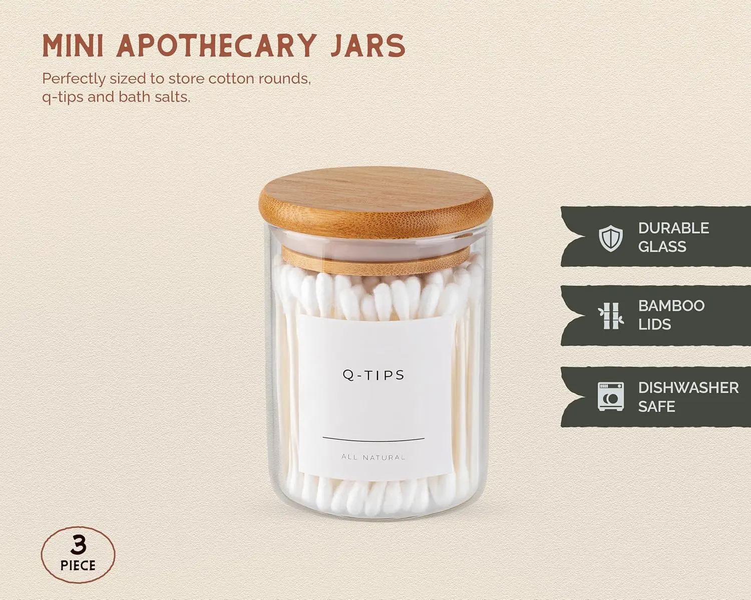 Mini Glass Apothecary Jars with Bamboo Lids 10 oz Set of 3 Clear Storage Containers for Cotton Balls Pads Swabs Bathroom Kitchen Durable Chip Resistant Glass Air Tight Lids - Canister, Bottles