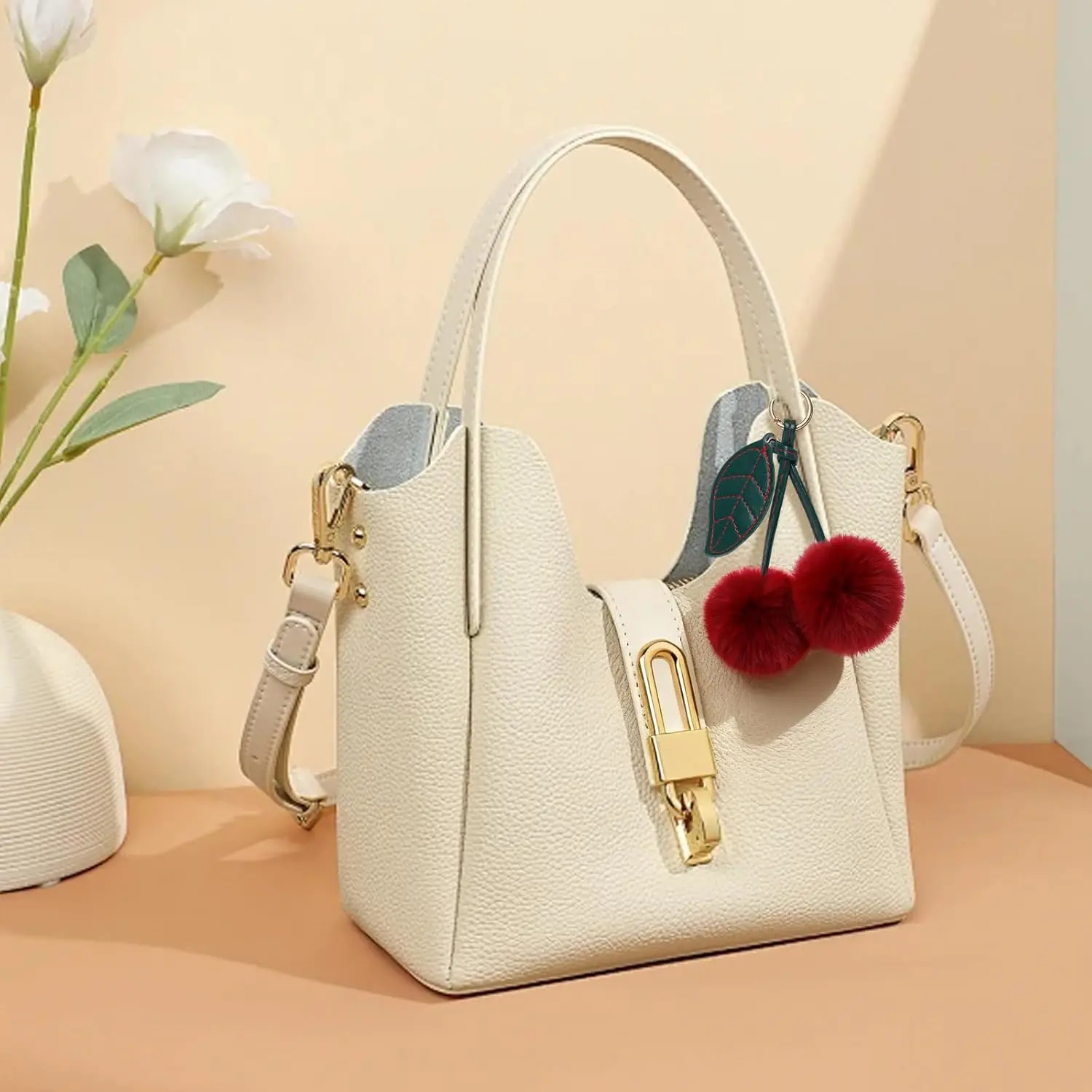 Aorable cherry keychain with ual fluffy pom-poms! Mae of faux rabbit fur with gol metal ring. Perfect cherry bag charm for purses, keys, an gifts. Measures 5.5 inches. Ieal gift for women.