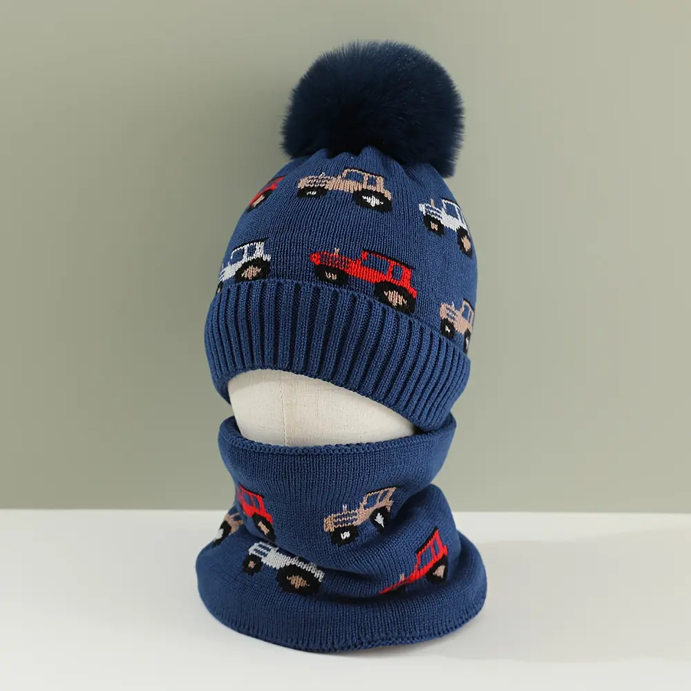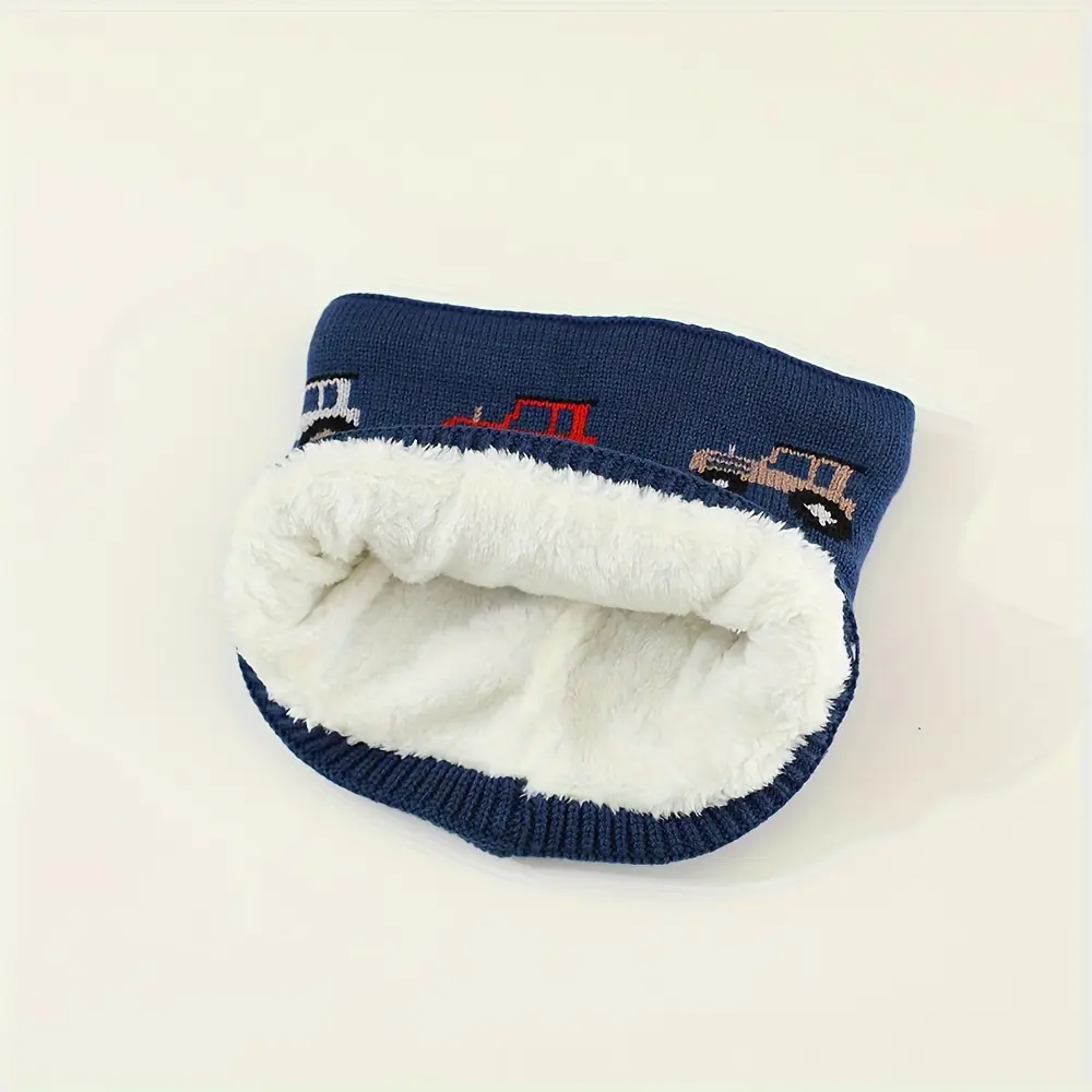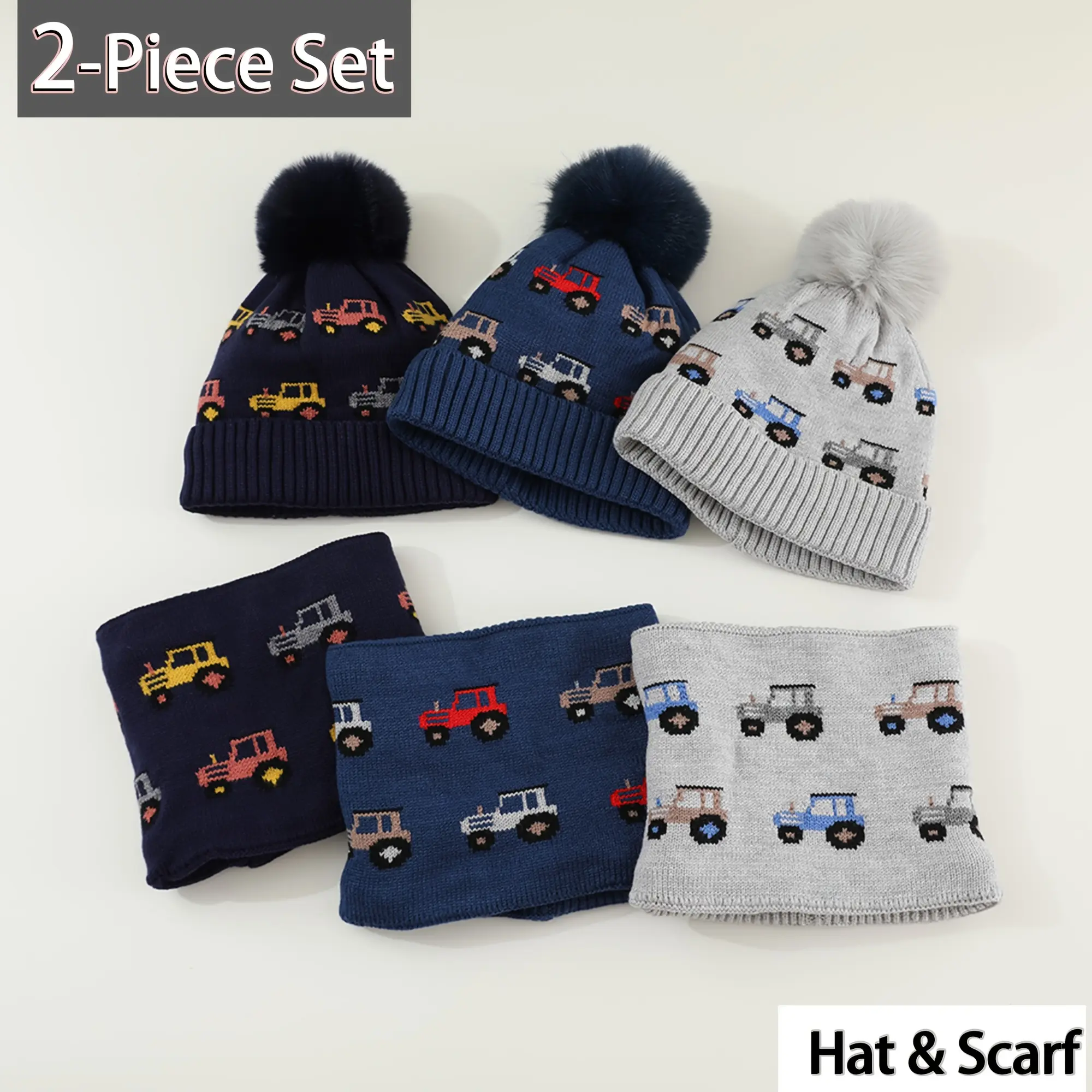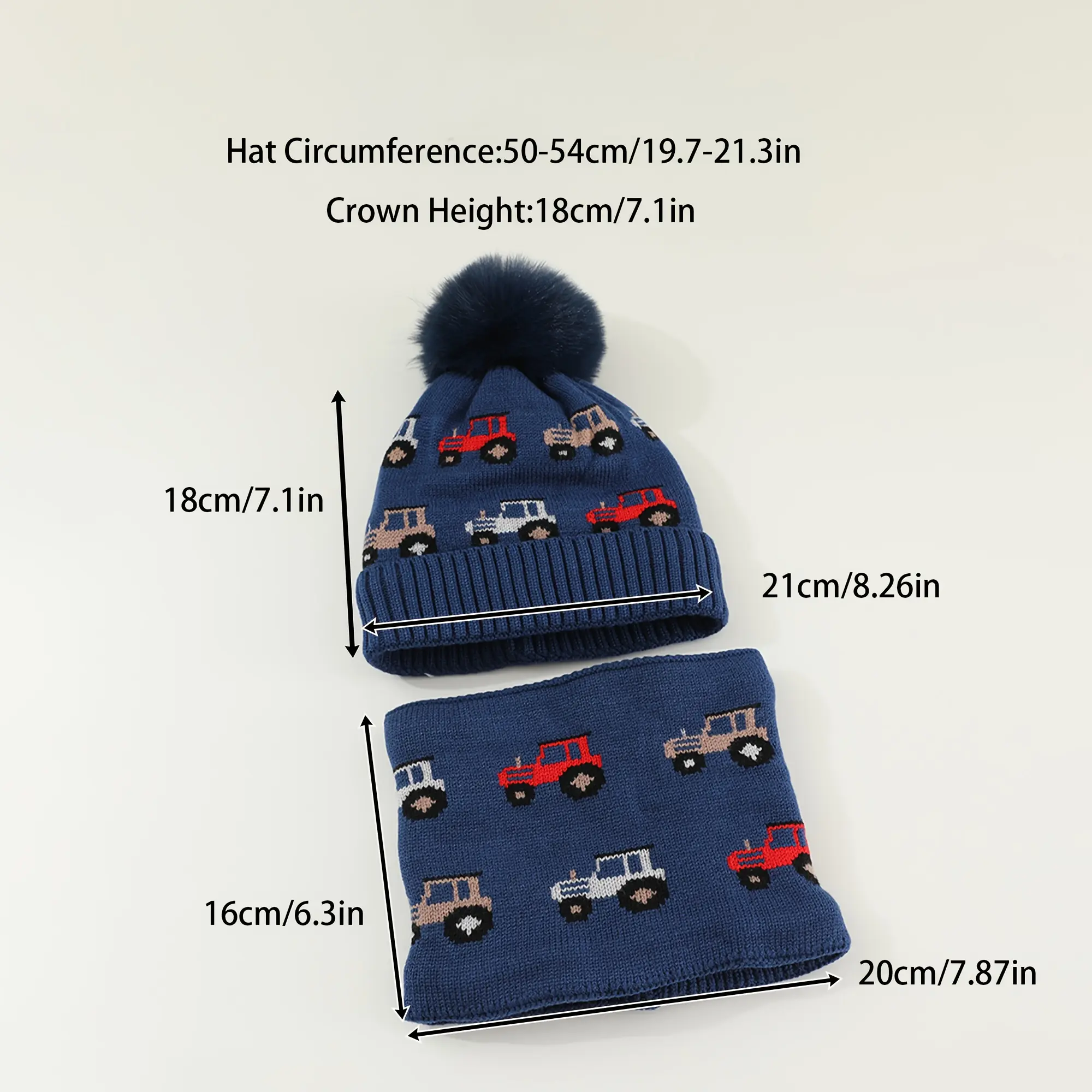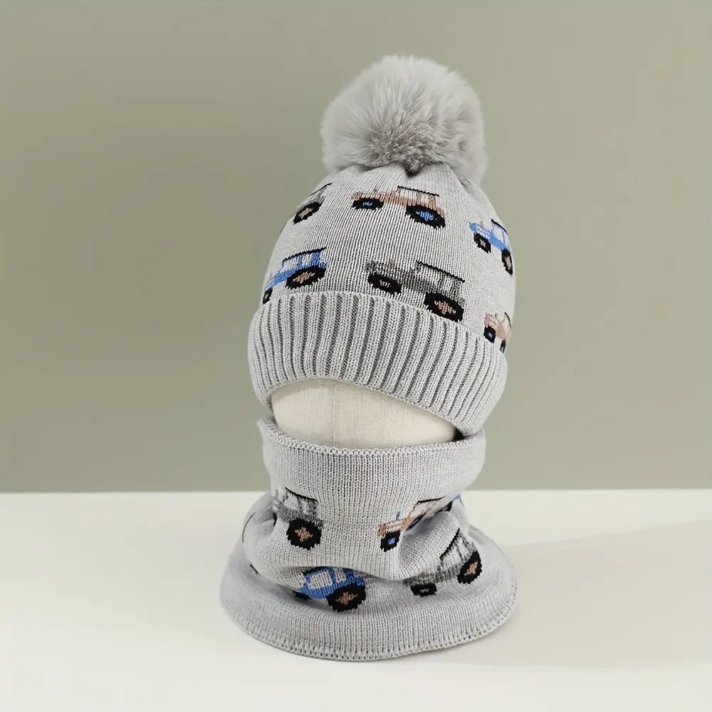 2pcs Boys' Winter Warm Hat & Scarf Set with Truck & Car Winter Adventure Print - Thick Knit Balaclava & Beanie, Elastic Fit for Outdoor Play, Christmas & Thanksgiving Outfits, Cozy Cold-Weather Clothing (Light Grey, Navy, Red, Blue, Black) - Hand Washable