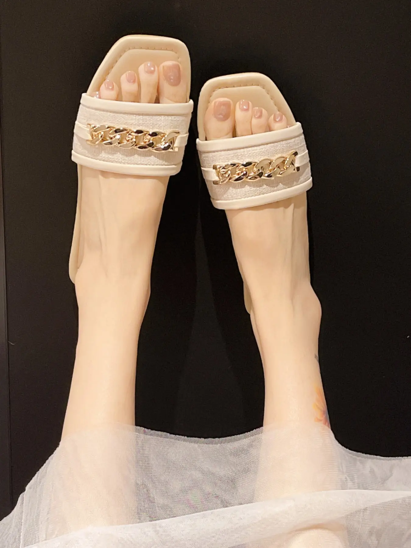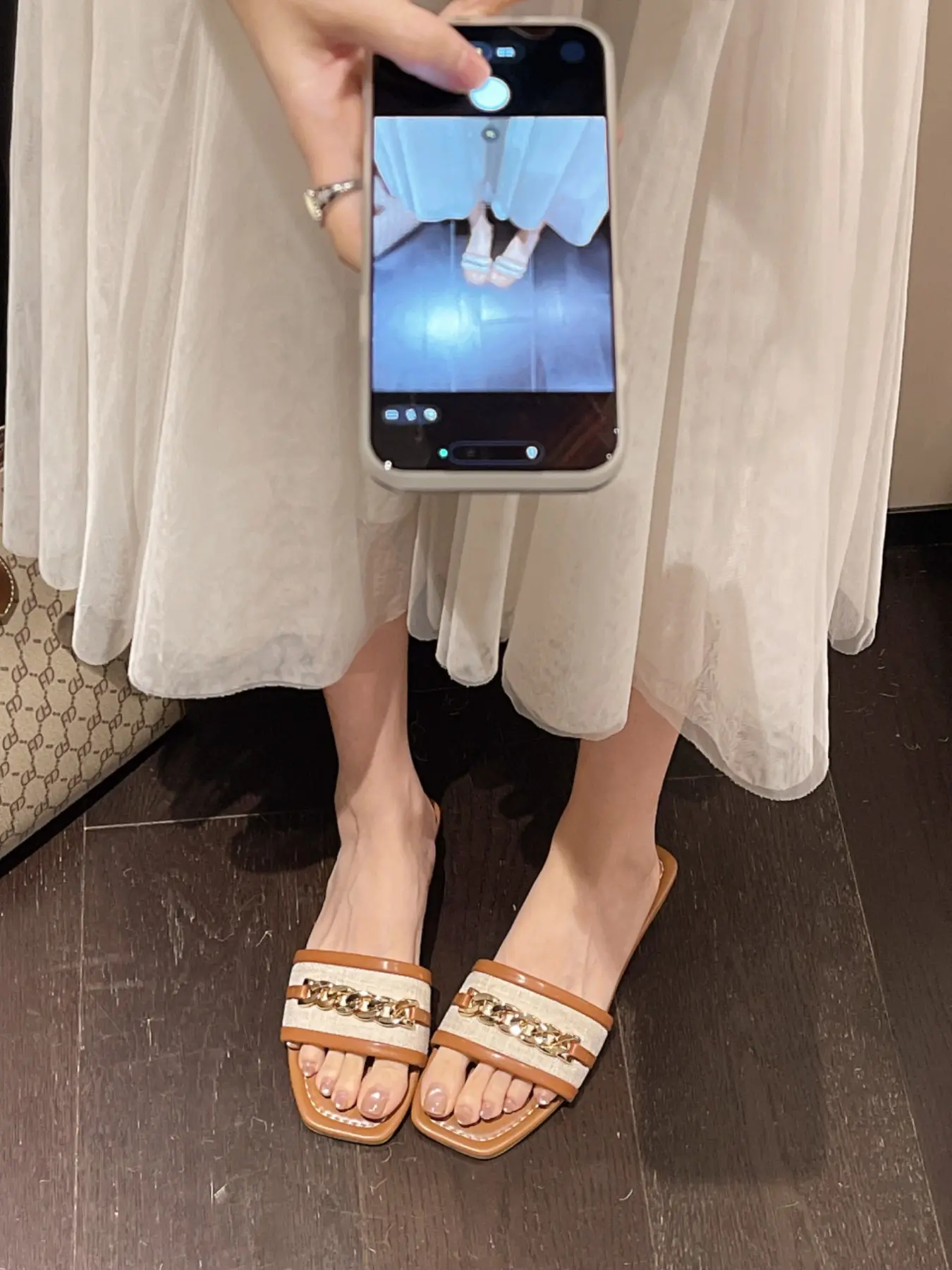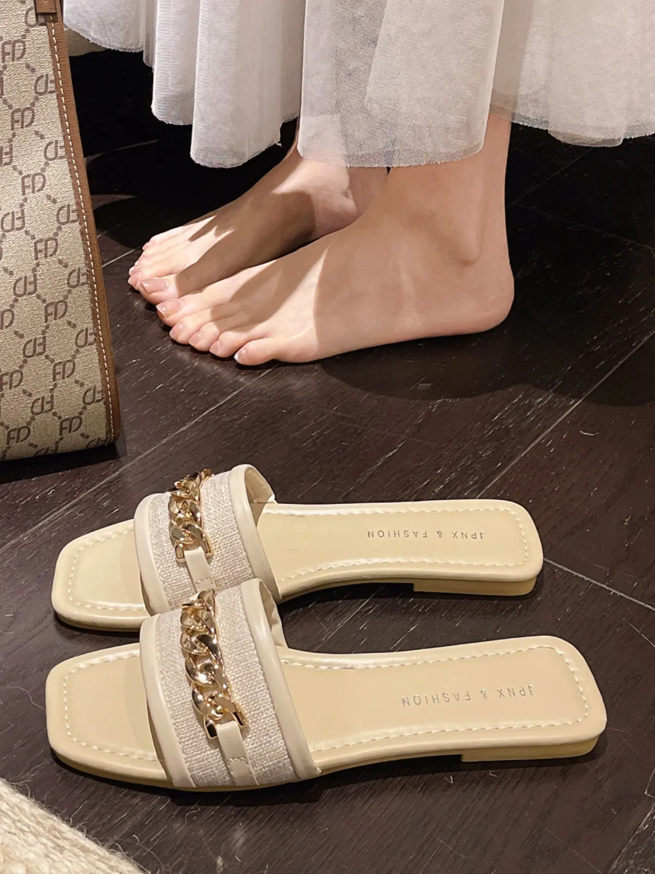 Women's Square Toe Sandals with Chain Decoration, Casual Flat Slip-On Shoes, Trendy Summer Fashion Footwear