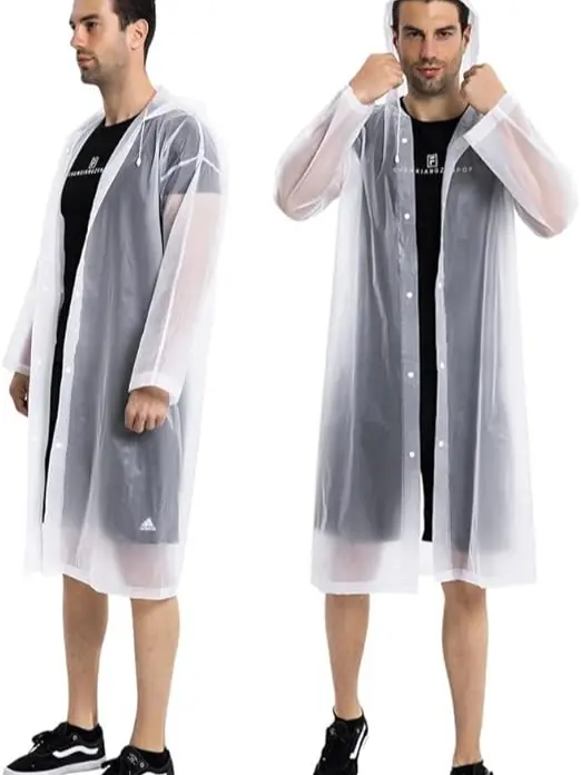 Made from 100% eco-friendly EVA material, this raincoat is non-toxic, odor-free, and safe to use. It is fully waterproof, lightweight, and features long sleeves with a drawstring hood to keep your head, neck, and arms completely dry in heavy rain.