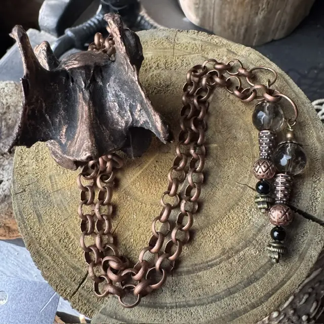 Electro-formed Coyote Vertebrae Bolo Tie Style Necklace with Smokey Quartz & Obsidian on Antique Red Copper Chain. Adjustable Length & Lobster Claw Closure for a custom fit!