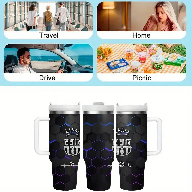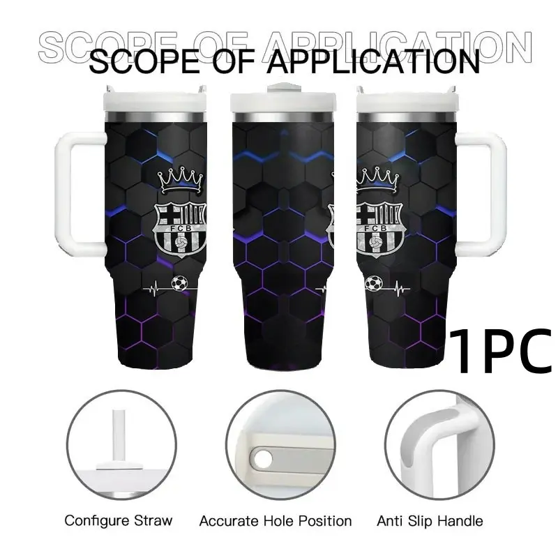 5. 1pc Barcelona Logo Honeycomb Stainless Steel Car Cup, Non-Slip Handle, Large Capacity Water Bottle, Football Theme, 40oz Insulated Cup with Straw