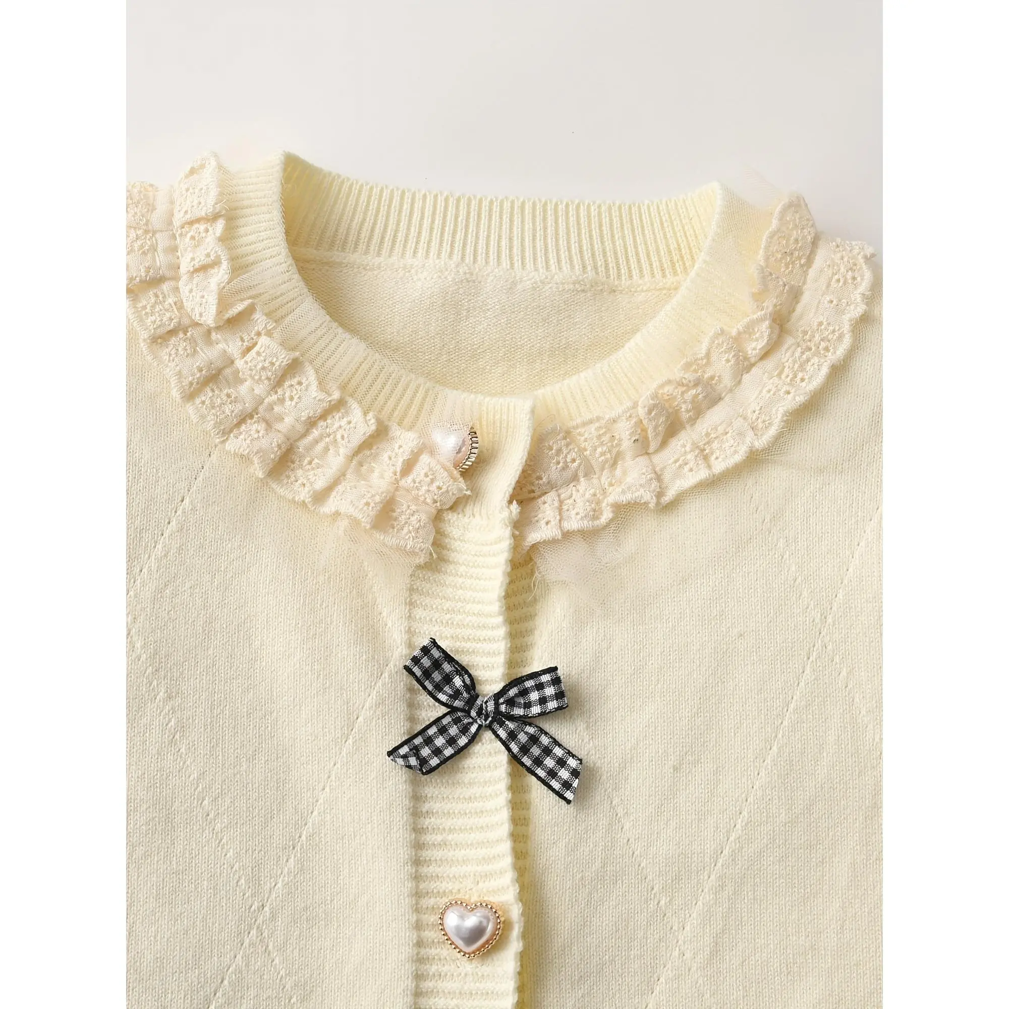 Girls' Elegant Knit Cardigan Sweater - Beige & Black Bow Accent Sweater, Soft Long Sleeve Button-Front Closure, Warm Breathable Sweater for Spring/Fall, Perfect for Everyday, Parties, School, and Outdoor Activities - Girls' Sweater, Party Outfit, Classic