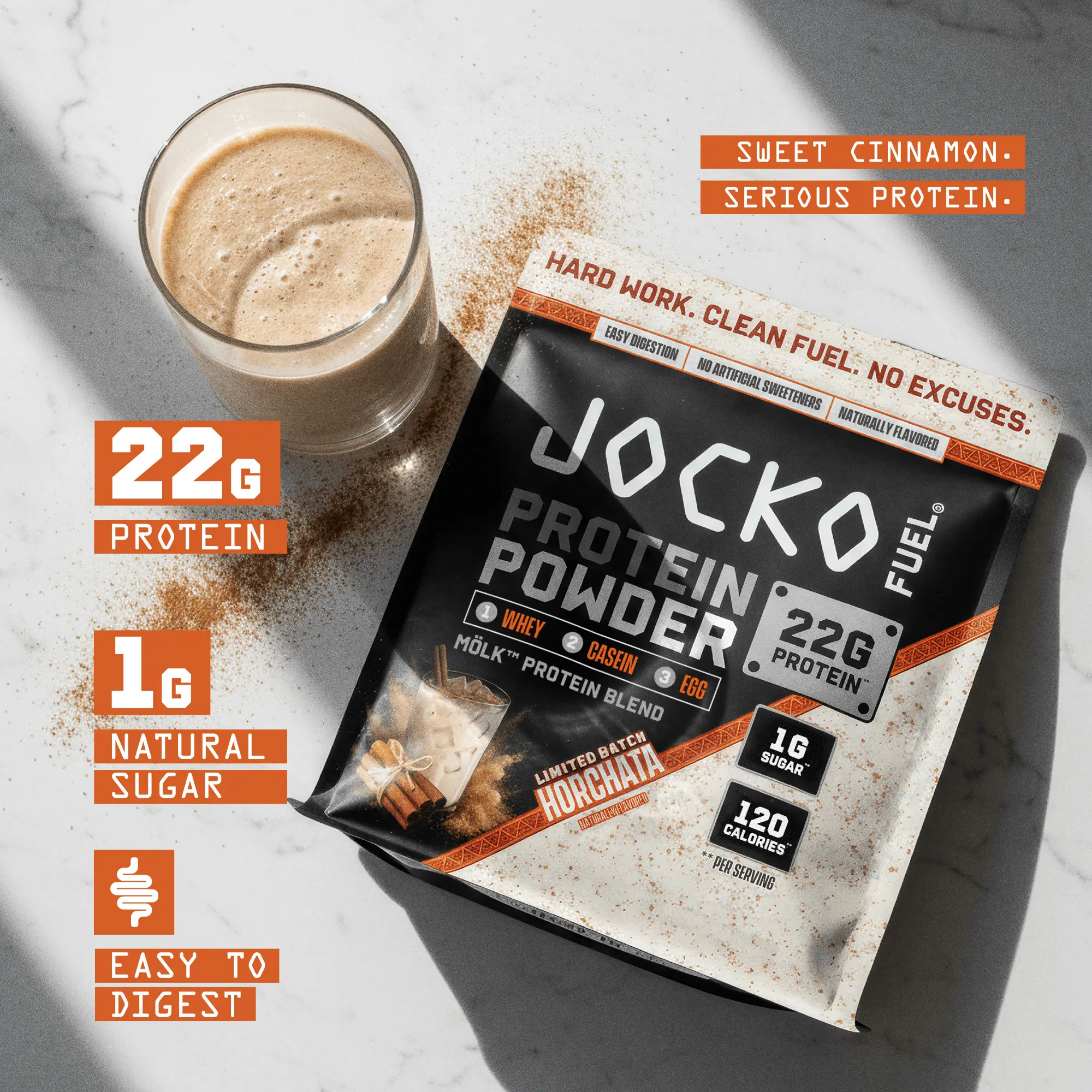 Enjoy Horchata Protein Powder—smooth, creamy, and warmly spiced with cinnamon and vanilla for that classic horchata taste. Jocko Mölk Protein Powder blends three protein sources into a precise, time-released formula to support muscle health all day. Added digestive enzymes and probiotics help deliver the protein you need without stomach aches or bloating. Sweetened with Jocko GOOD Sweetener™ (allulose, monk fruit extract, and reb-M) for delicious, low-calorie sweetness. Limited edition.