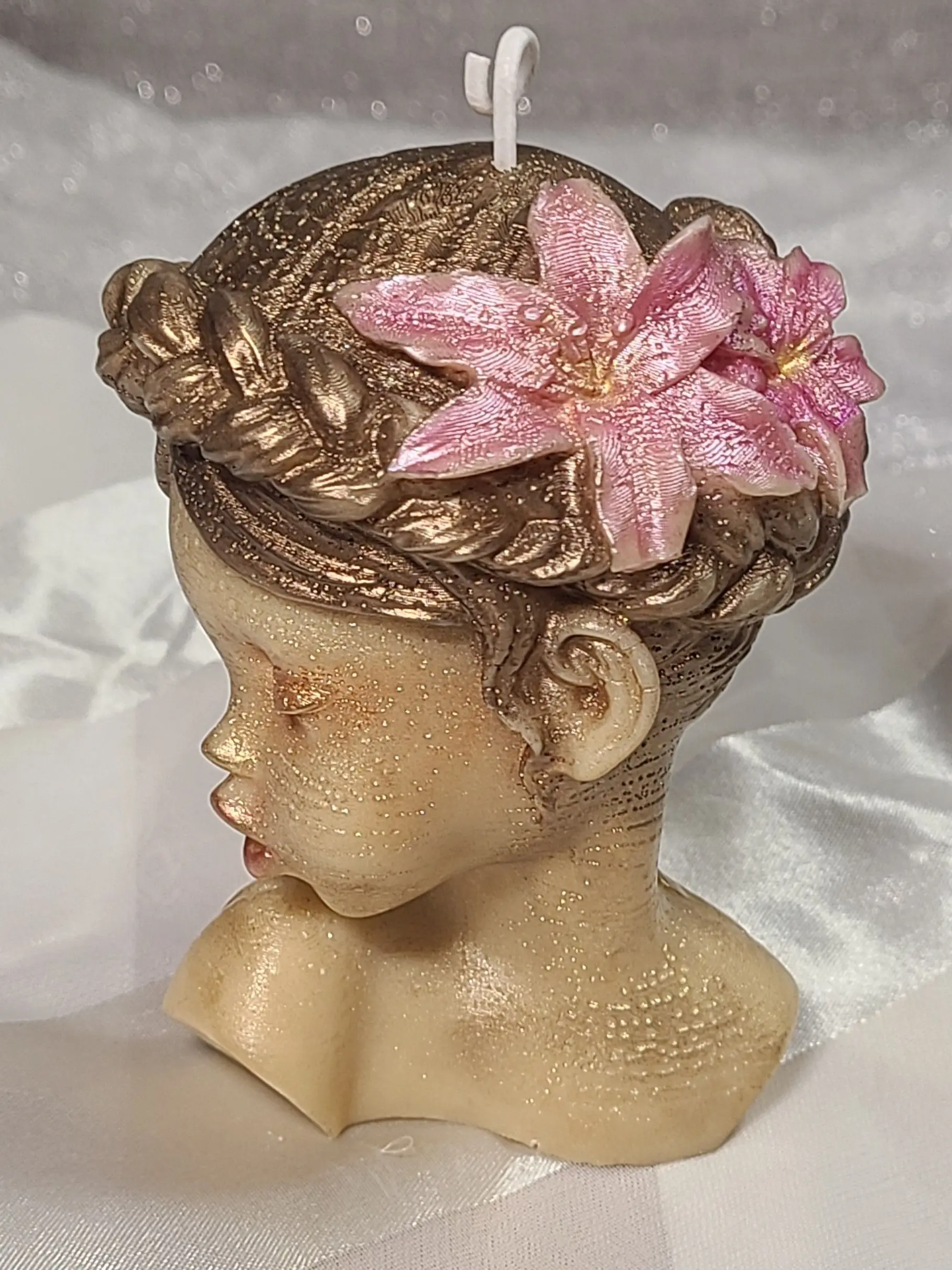 This beautiful candle is shaped in the style of a charming young girl with flowers in her hair. Hand-painted in shimmery micas.