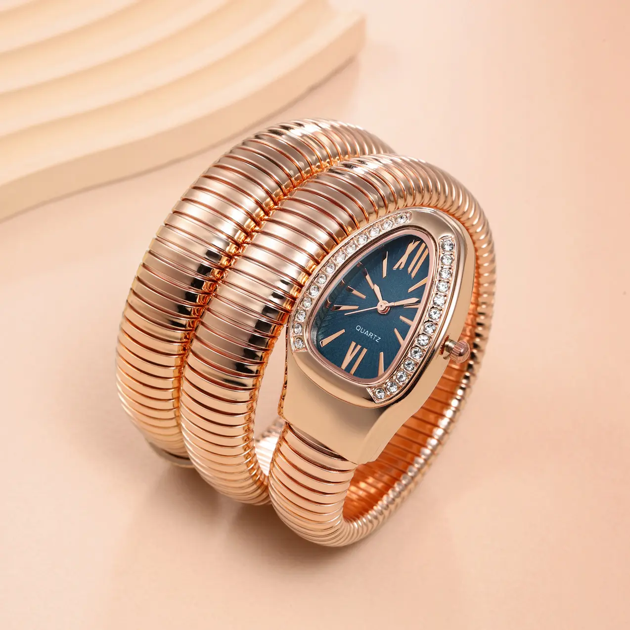 Women's Luxury Gold Snake Bangle Quartz Watch - Wrap Around Wristwatch with Crystal Diamond Bezel, Mother of Pearl Dial, Roman Numerals, Elegant Retro Statement Timepiece, Perfect Gift for Her
