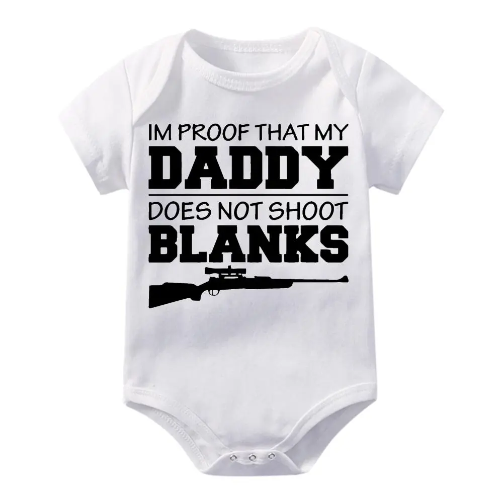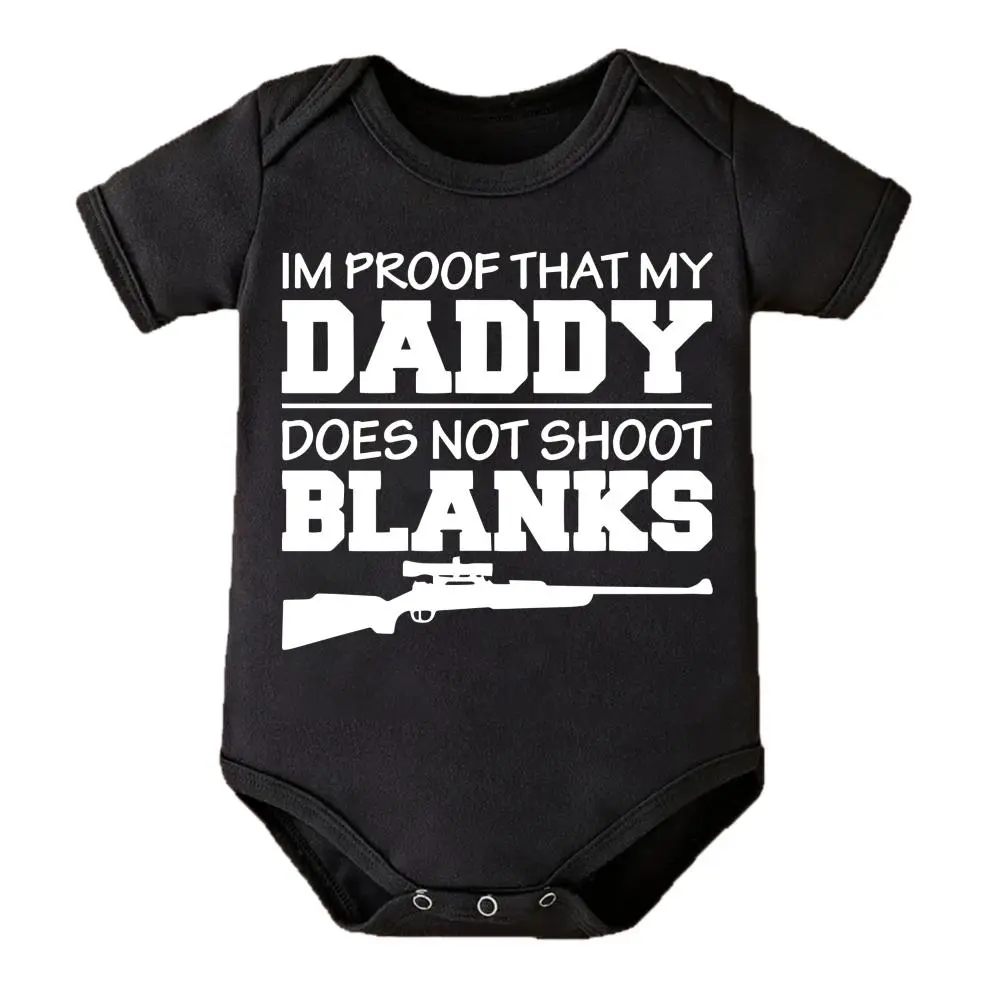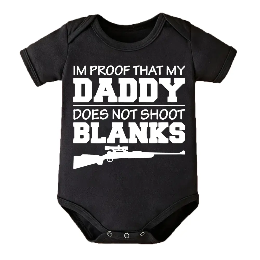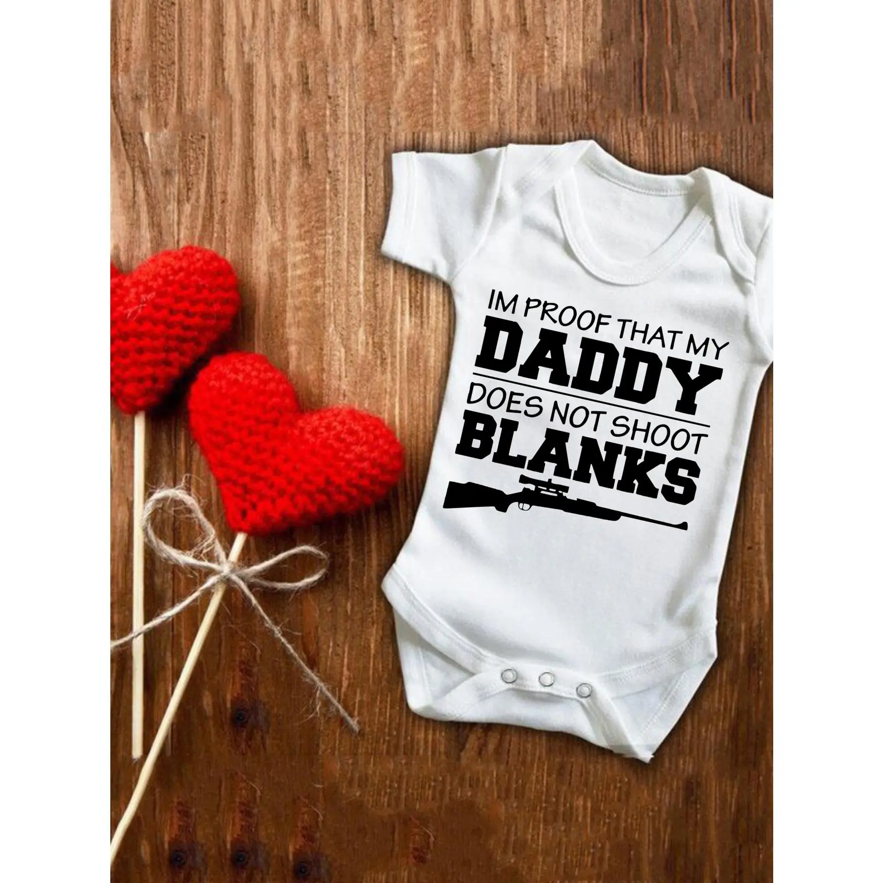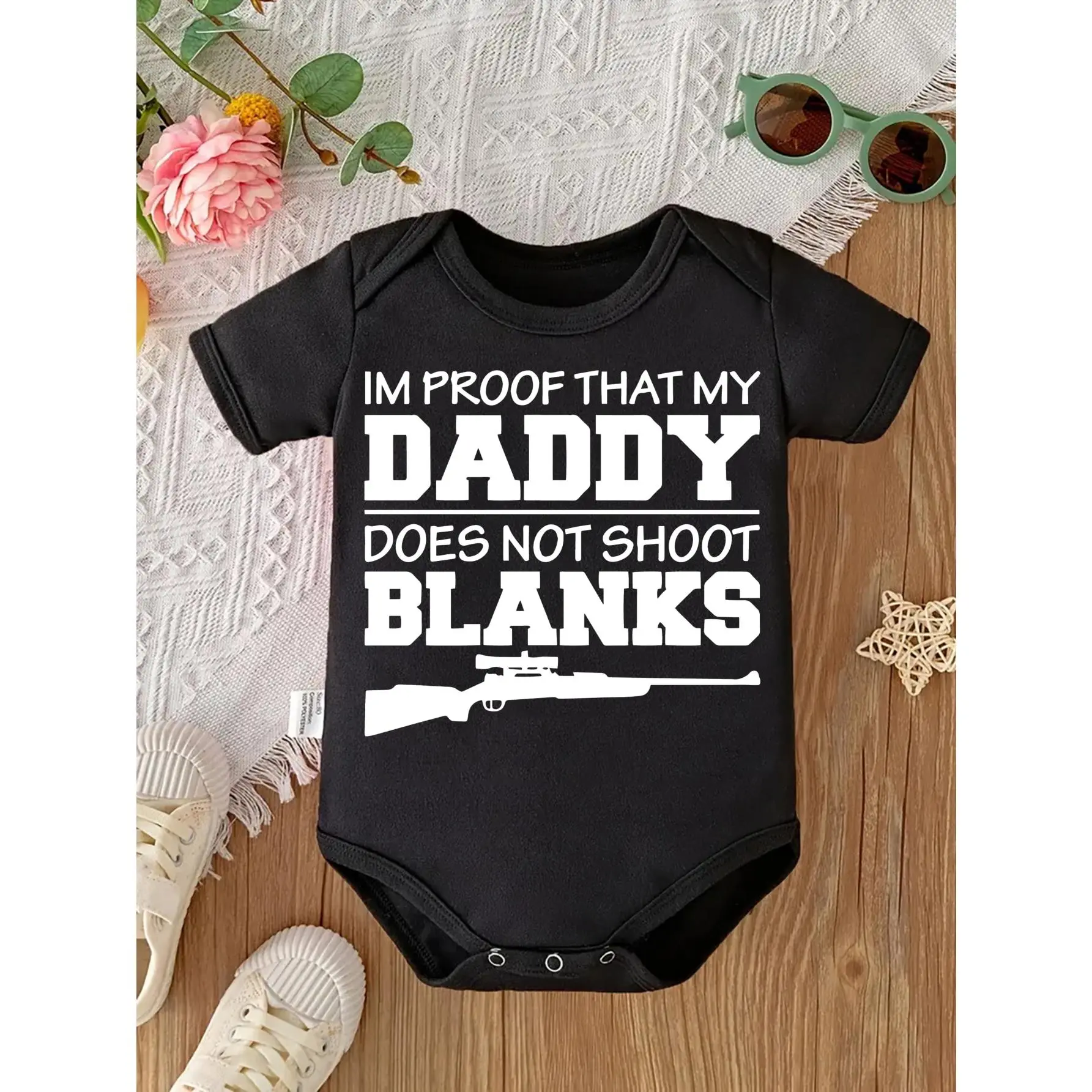 Cute Baby Bodysuit With I M Proof That My Daddy Does Not Shoot Blanks Print Soft Versatile Round Neck Button Detail Regular Fit All Seasons Knitted Fabric Onesie