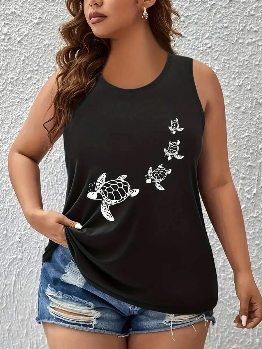 Women'S Plus Size Sleeveless Tank Top With Turtle And Hatchling Print - Casual Black V-Neck Vest For SpringSummerFall, Stretchy Fabric, Machine Washable, Summer Tank Top