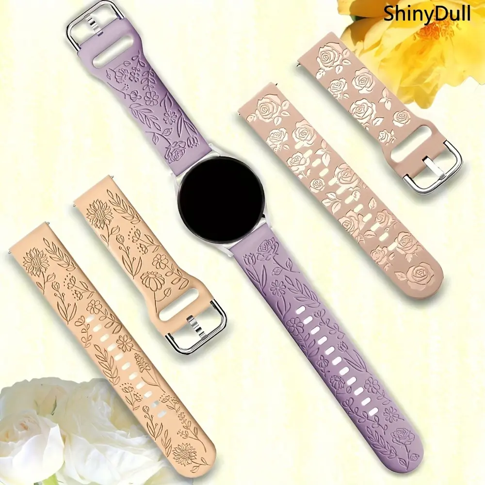 5. 3-Pack Floral Engraved Silicone Watch Bands – 20mm Soft Waterproof Sport Strap for Samsung Galaxy Watch 3–5 & Active 2, Rose & Sunflower Design, Unisex