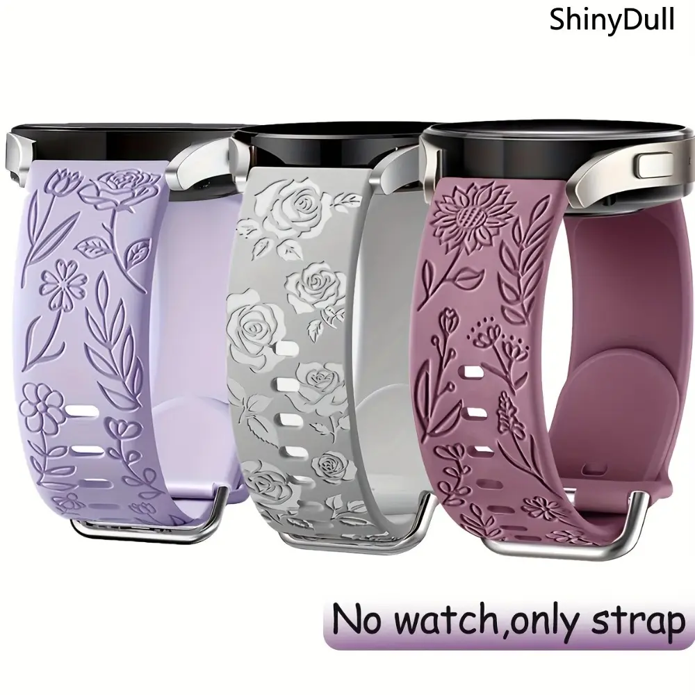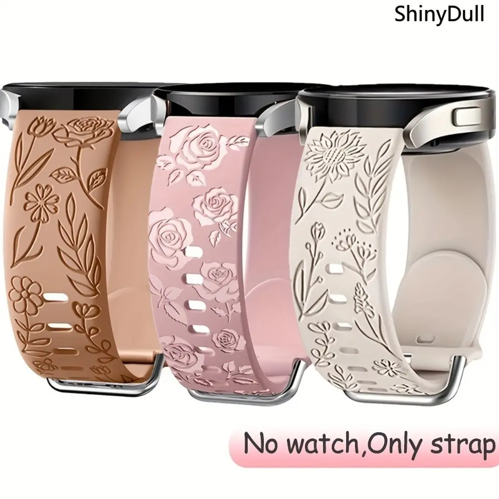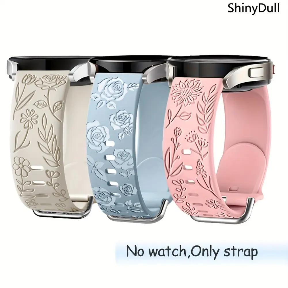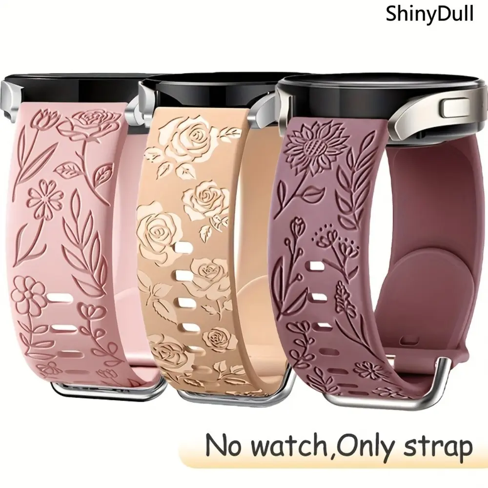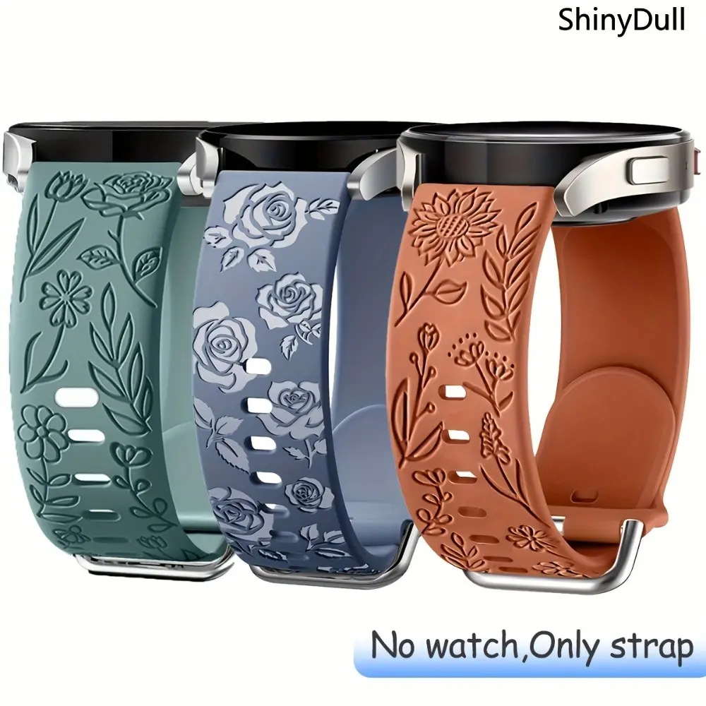 3-Pack Floral Engraved Silicone Watch Bands – 20mm Soft Waterproof Sport Strap for Samsung Galaxy Watch 3–5 & Active 2, Rose & Sunflower Design, Unisex