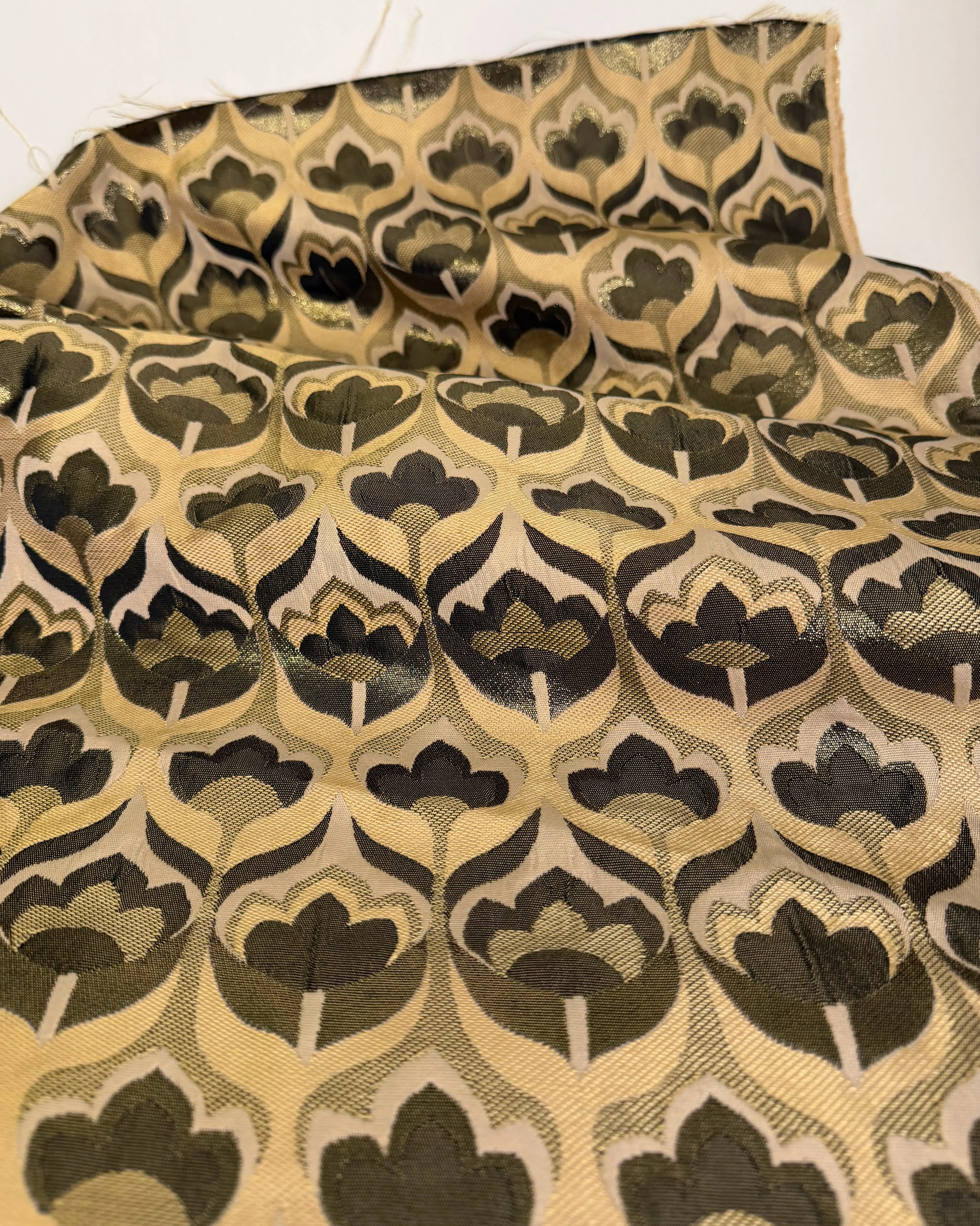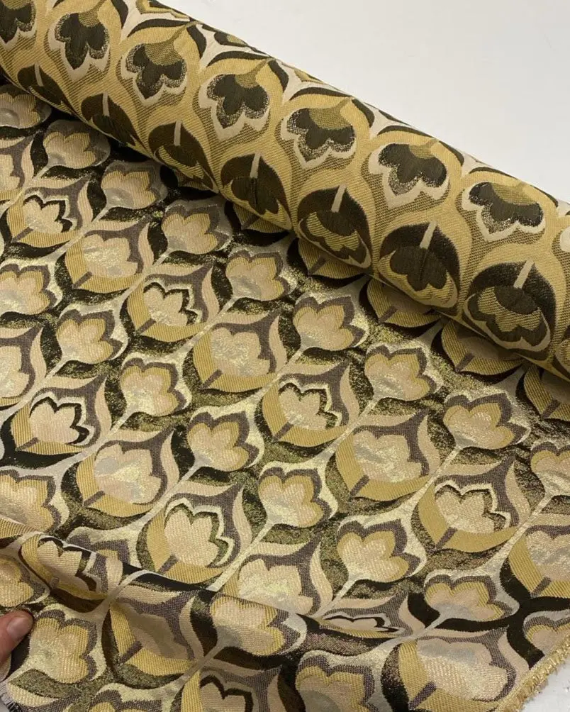 Indulge in the elegance of this luxurious Italian jacquard deadstock, woven from 70% polyester and 30% lurex. The fabric features unique gold‑shimmer floral motifs that catch the light beautifully, adding depth and sophistication to its textured weave. Though the original designer is unknown, the craftsmanship is unmistakably high‑end. With its structured hand and luminous finish, this jacquard is perfect for luxurious pillows, home décor accents, jackets, skirts, and statement pieces that call for richness and dimension.