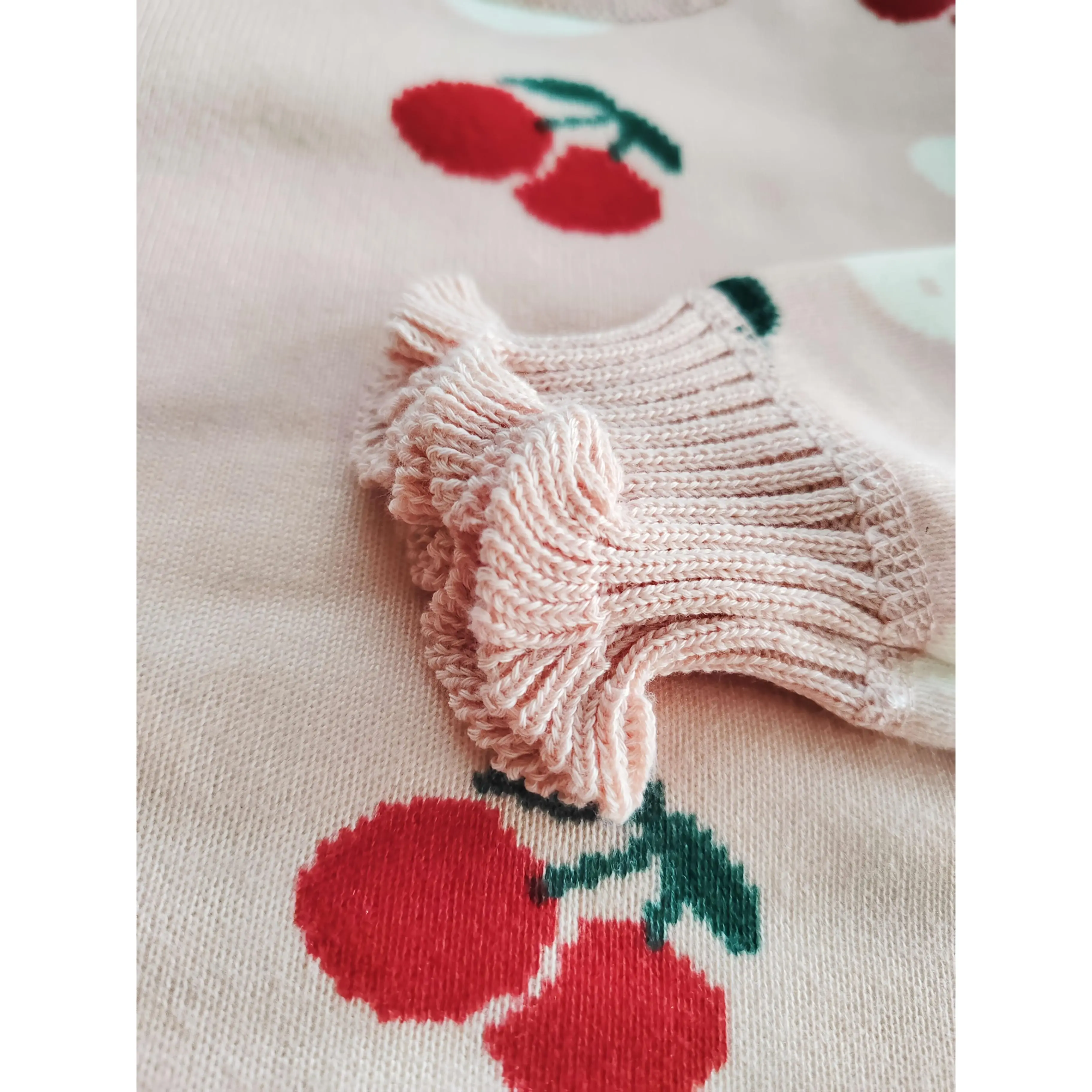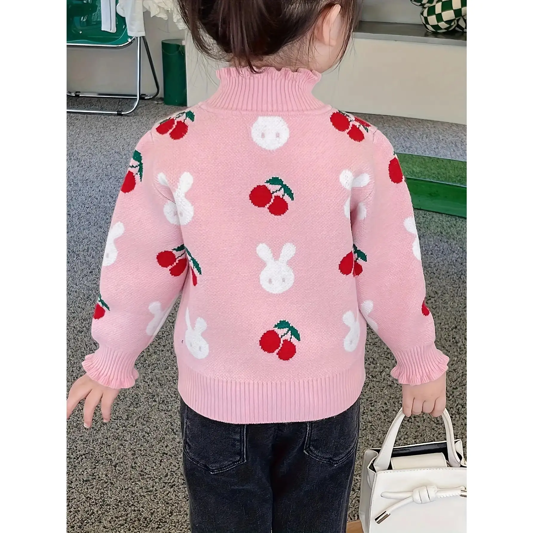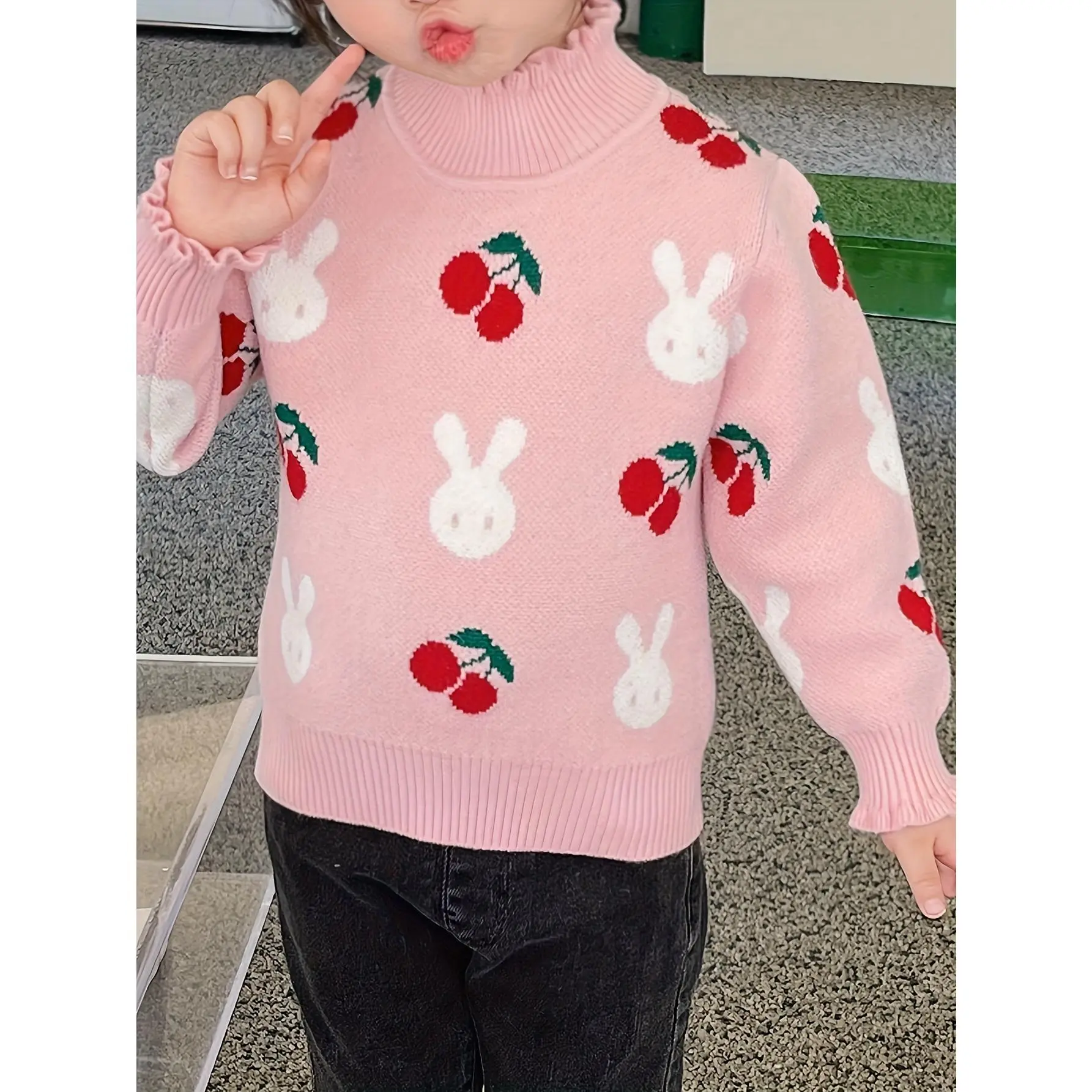 Girls' Cozy Fleece-Lined Thick Knit Sweater with Adorable Bunny & Cherry Berry Pattern - Long Sleeve Crew Neck, Warm Fall/Winter Pullover for Youngsters, Casual Playwear, Winter Youngsters Wear, Playful Youngsters Design, Soft Youngsters Clothing