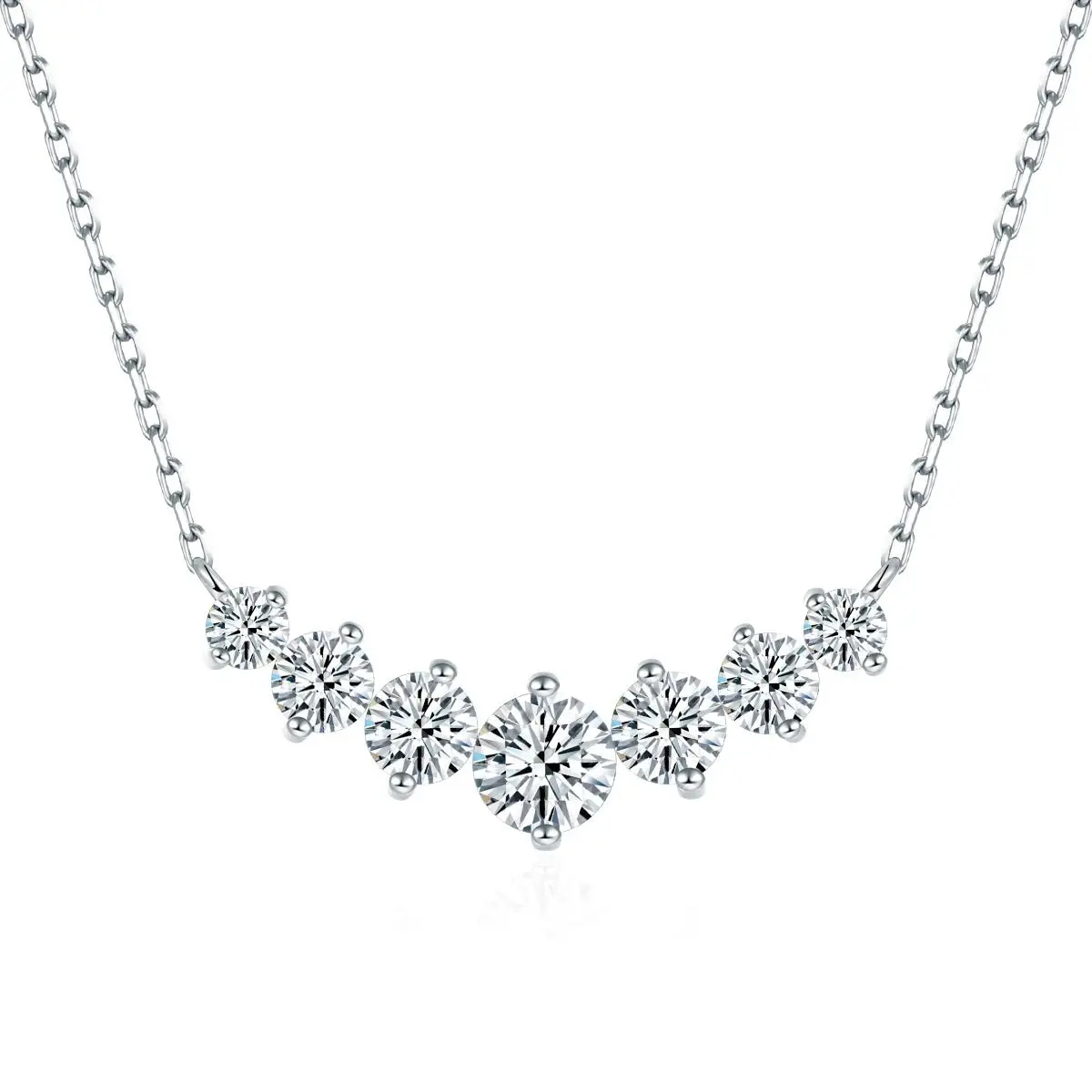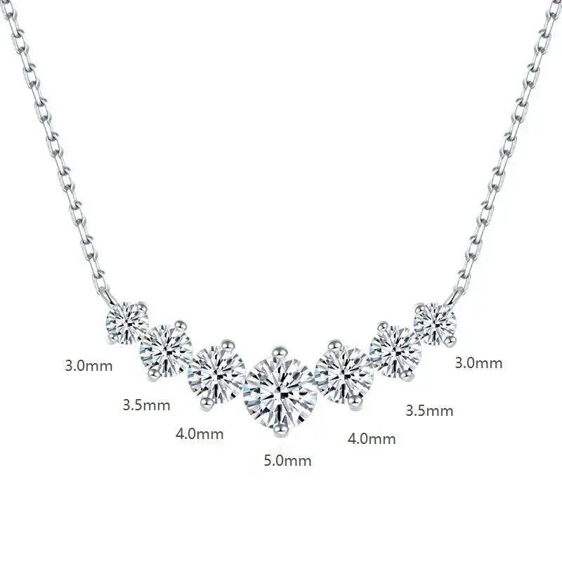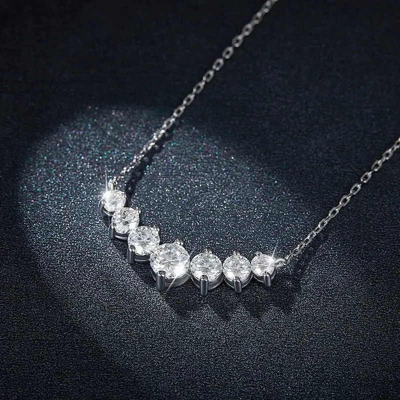 Effortless luxury in motion. This delicate necklace features seven round, GRA-certified moissanite stones set in a gentle arc—each one catching light like tiny stars. Polished 925 sterling silver chain keeps it light and wearable, perfect for layering or solo glow. Quiet Brilliance: understated shine for everyday elegance, weddings, or gifts. Unisex, timeless, and diamond-bright without the price tag.