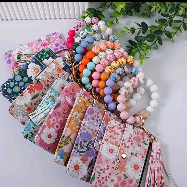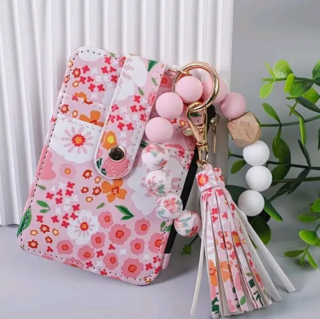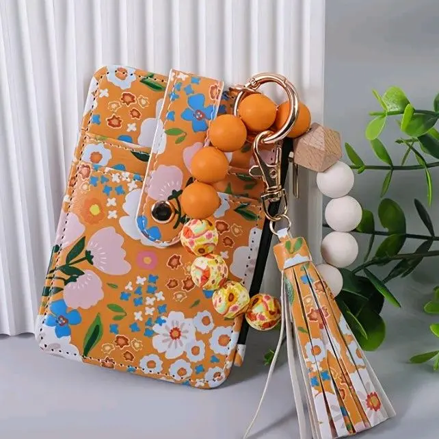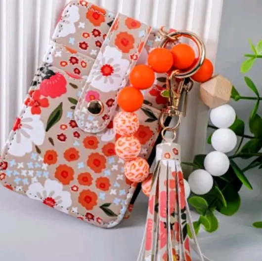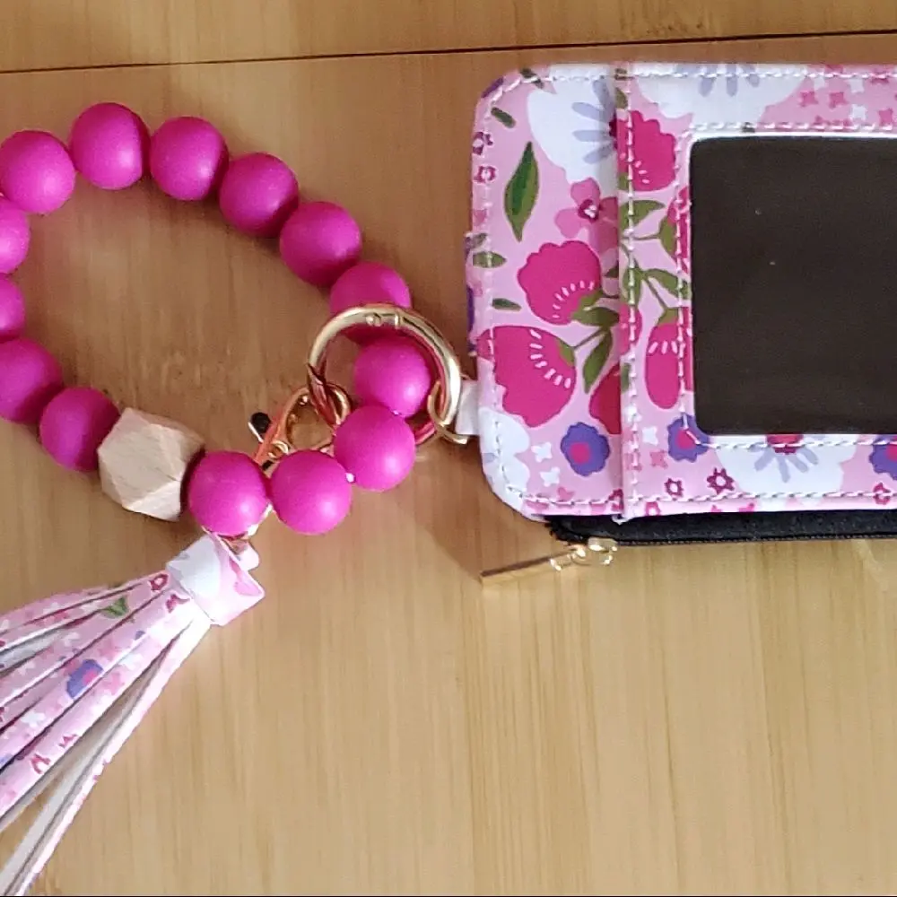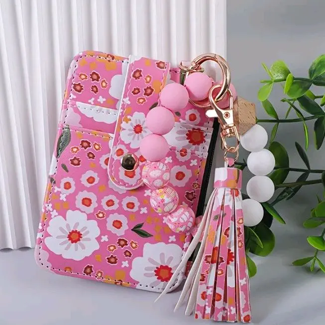 Floral Beaded wristlet keychain, wallet, coin purse with tassel.