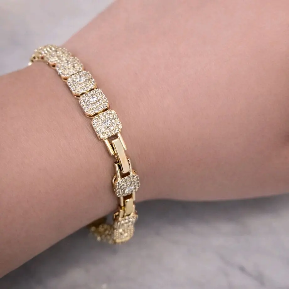 Add a touch of elegance to your look with this stunning tennis bracelet, featuring a modern square link design fully adorned with high-quality cubic zirconia stones for maximum sparkle