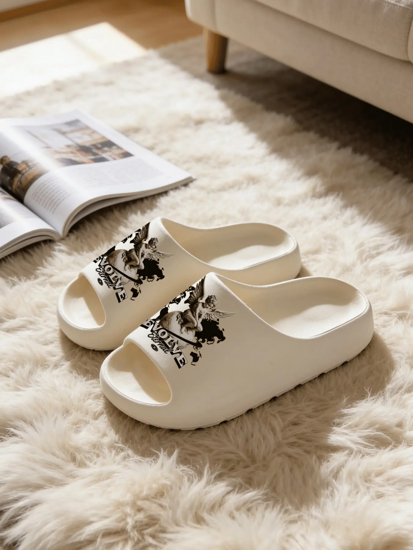1 Pair Angel Print Fashion Slippers, American Street Style, Thick Sole Soft Bottom, Couples Home Outdoor Use, Asymmetrical Cartoon Design