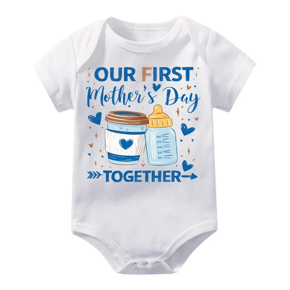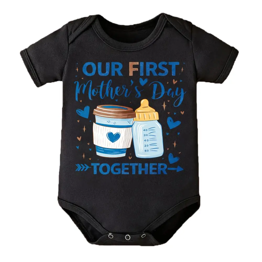 Cute Baby Bodysuit With Our First Mothers Day Together Coffee And Bottle Print Soft Versatile Round Neck Button Detail Regular Fit All Seasons Knitted Fabric Onesie