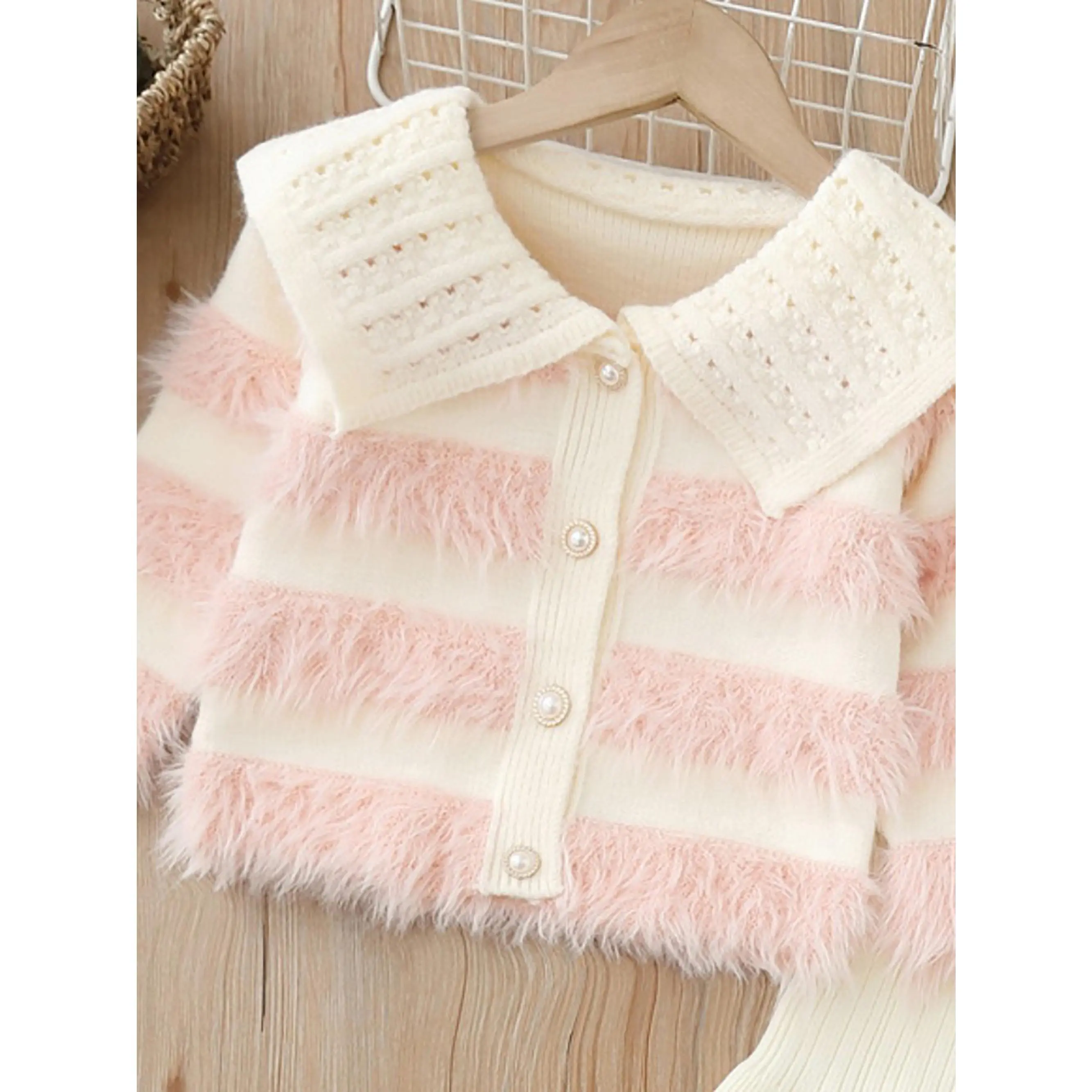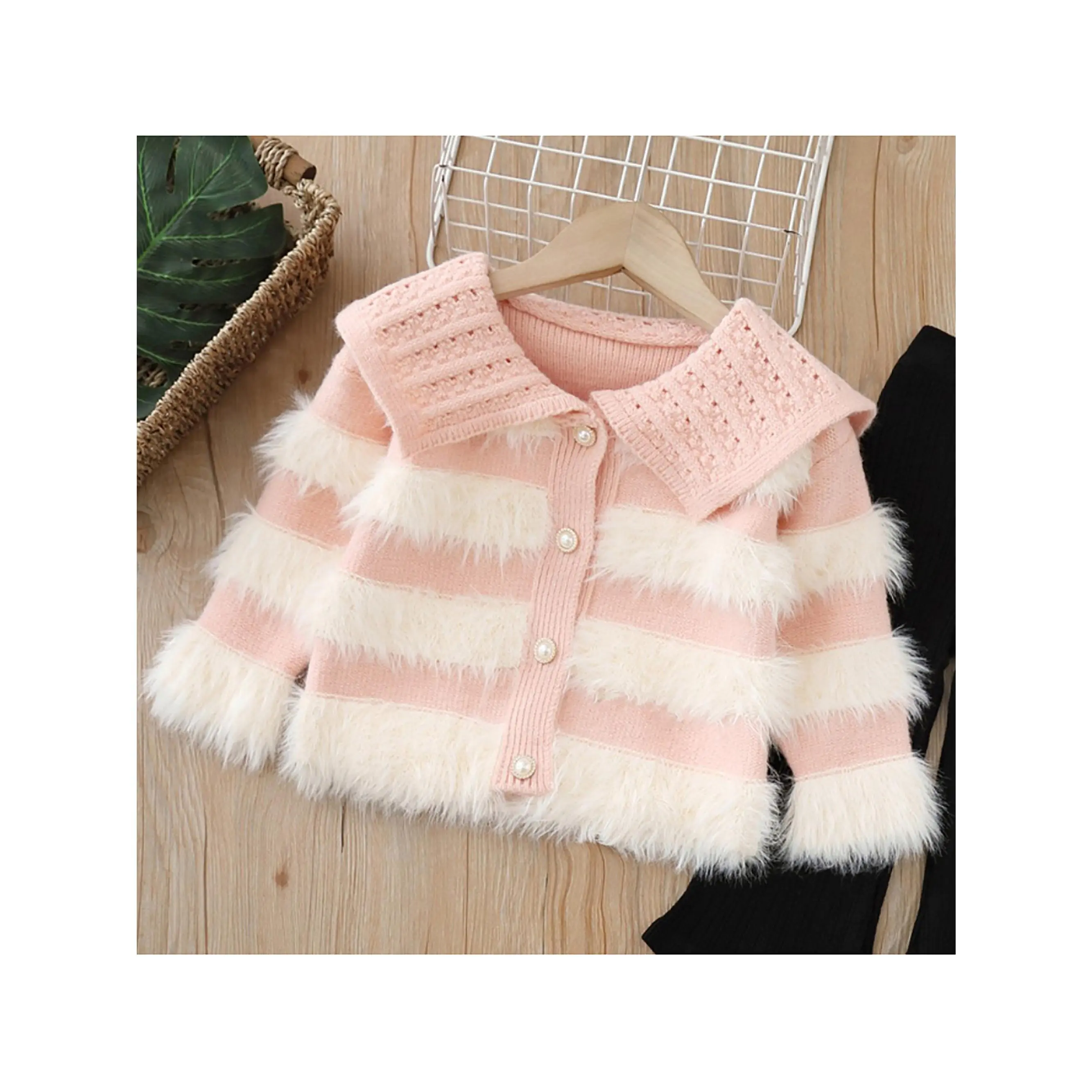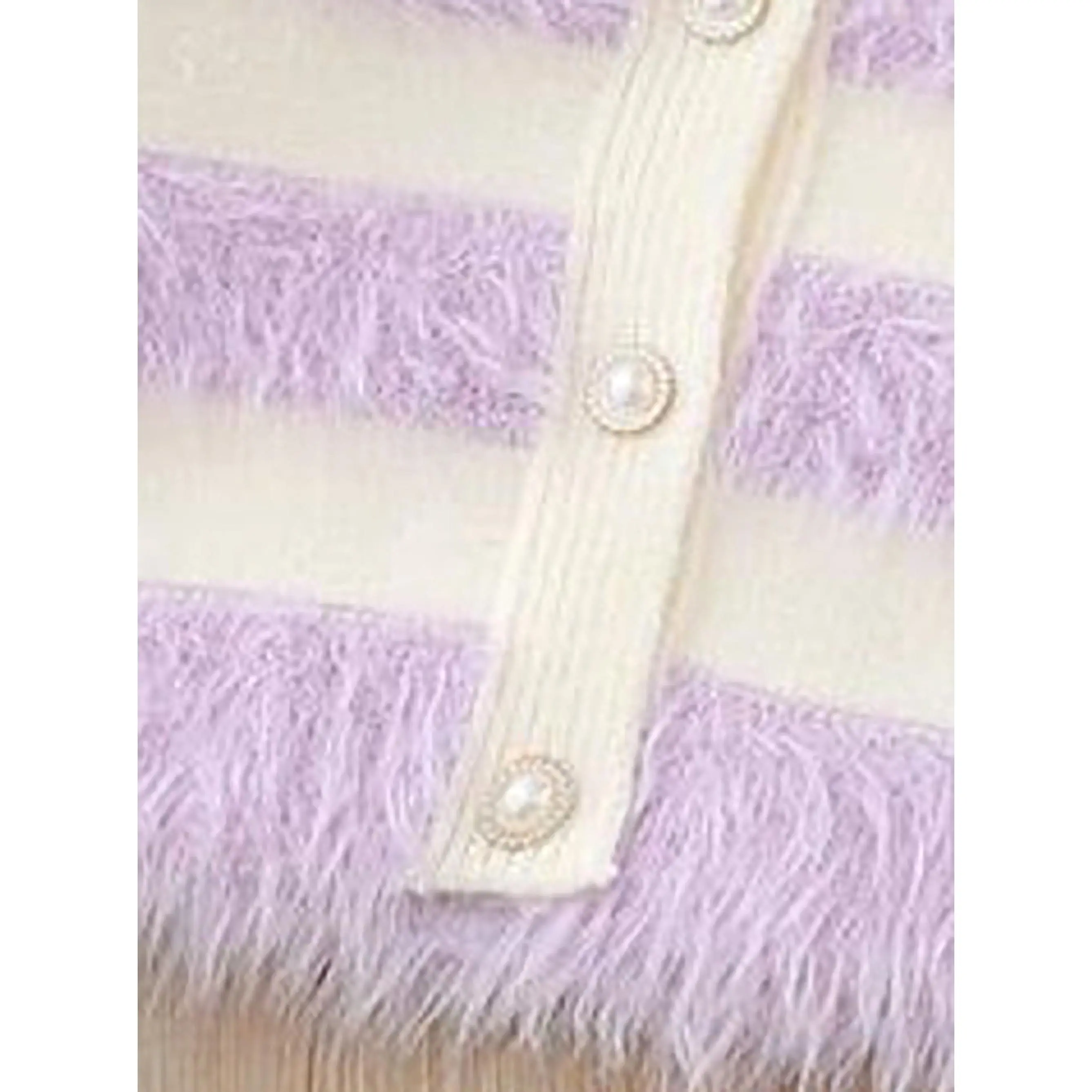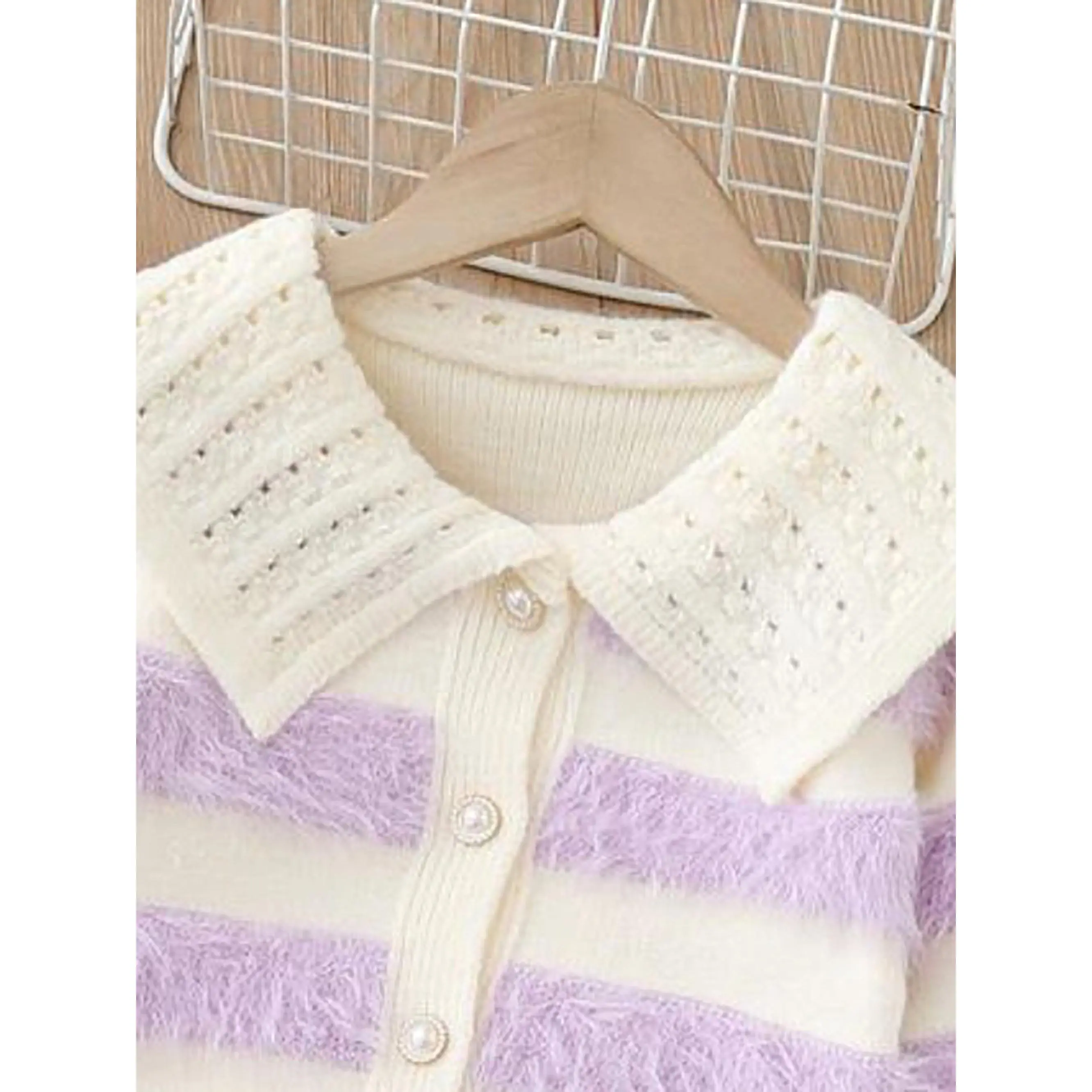 Girls' ted Knit Sweater with Plush Stripes & Pearl Buttons - Soft Pastel Purple & Contrast, Cozy Lapel Collar, Loose Fit Winter Warmth, Cute Casual Daily Wear for Fall/Winter, Easy Button-Front Closure (No Zippers) - Ideal for School & Playdates - D