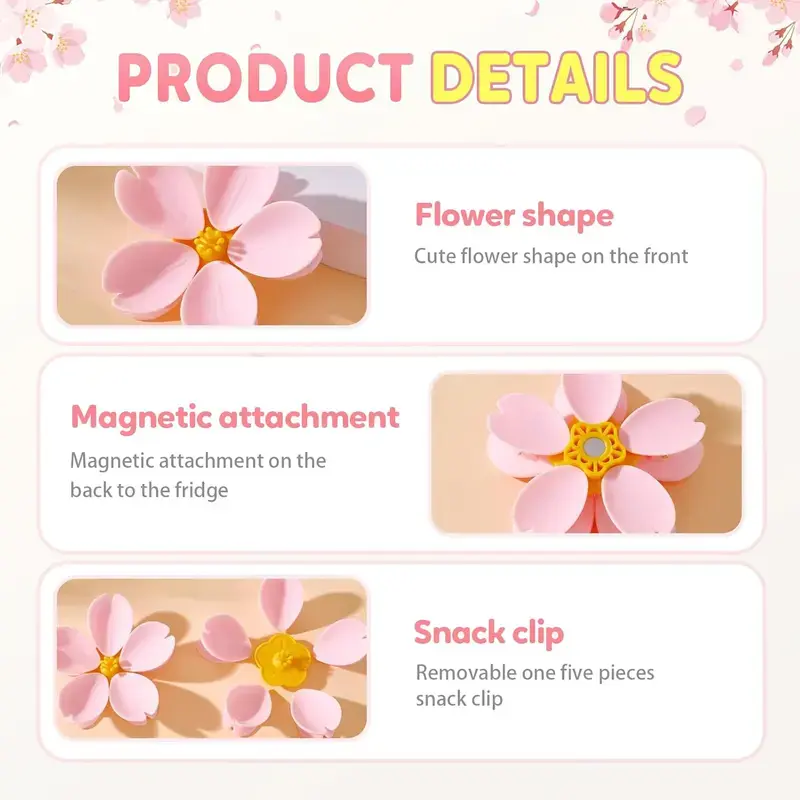 This adorable magnetic flower clip set is the ultimate 2-in-1 kitchen accessory. A beautiful cherry blossom decoration for your refrigerator that also serves as a set of handy food sealing clips. Never lose a clip again—they stick right back onto the flower when you’re done!
