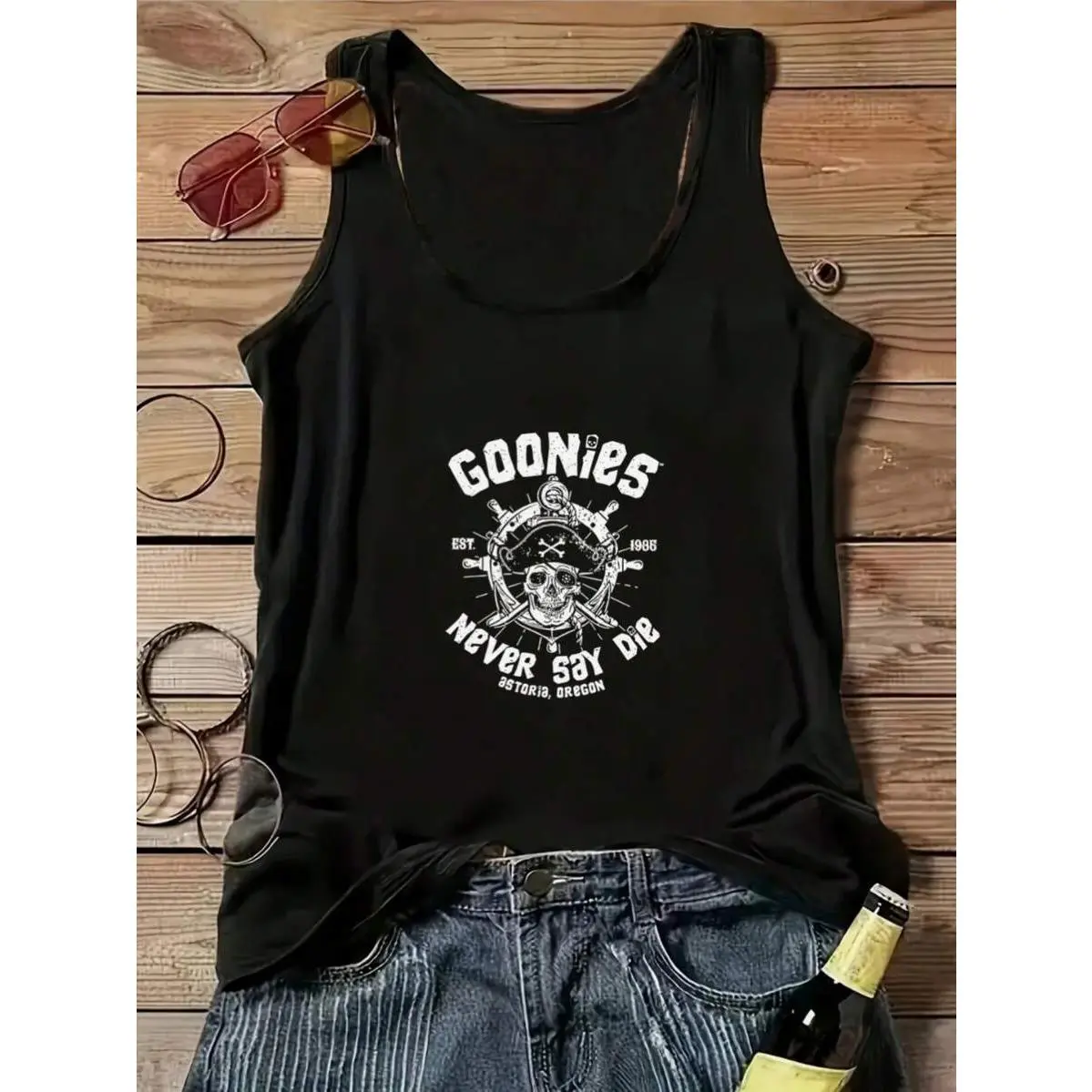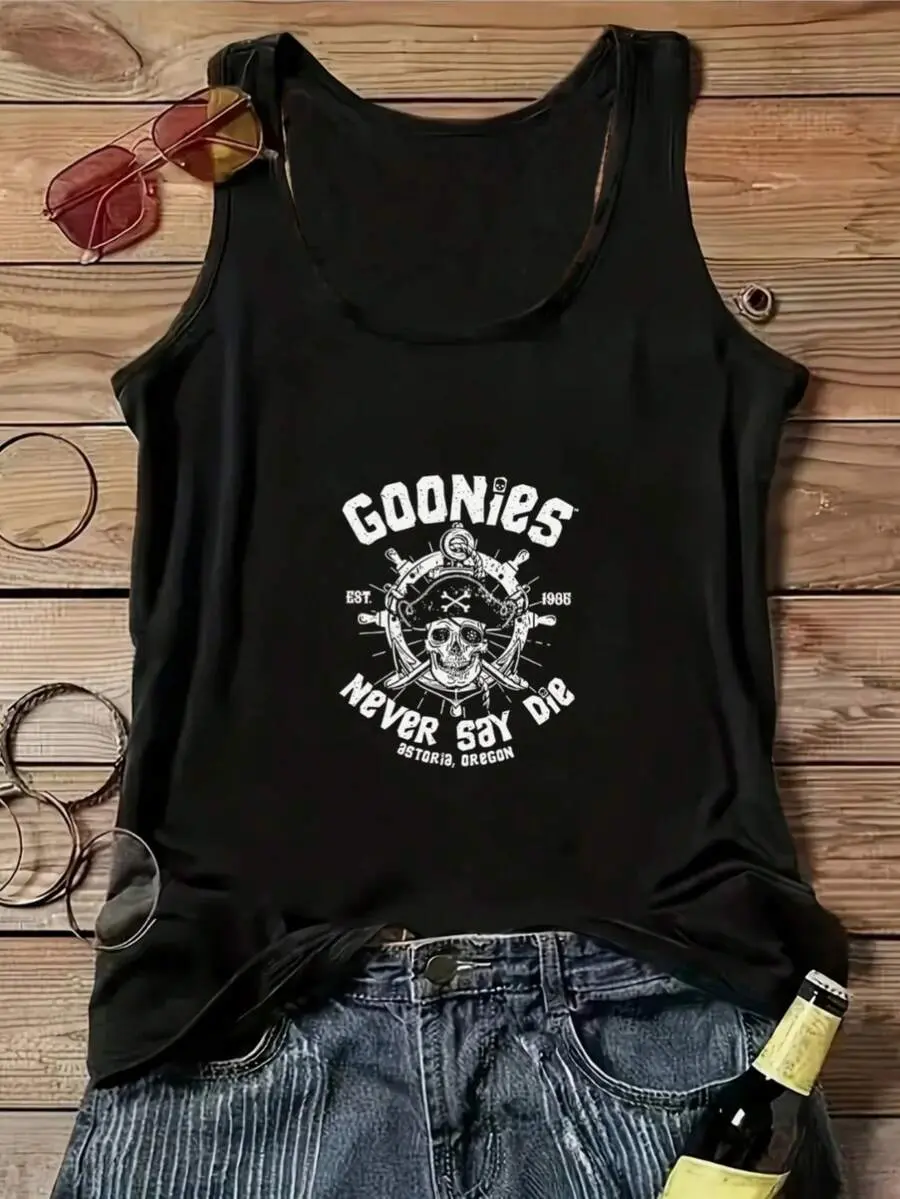 Plus Size, Black Vest - Goonies Never Say Die - Pirate Element Print - Vintage Eye-Catching - Favorite